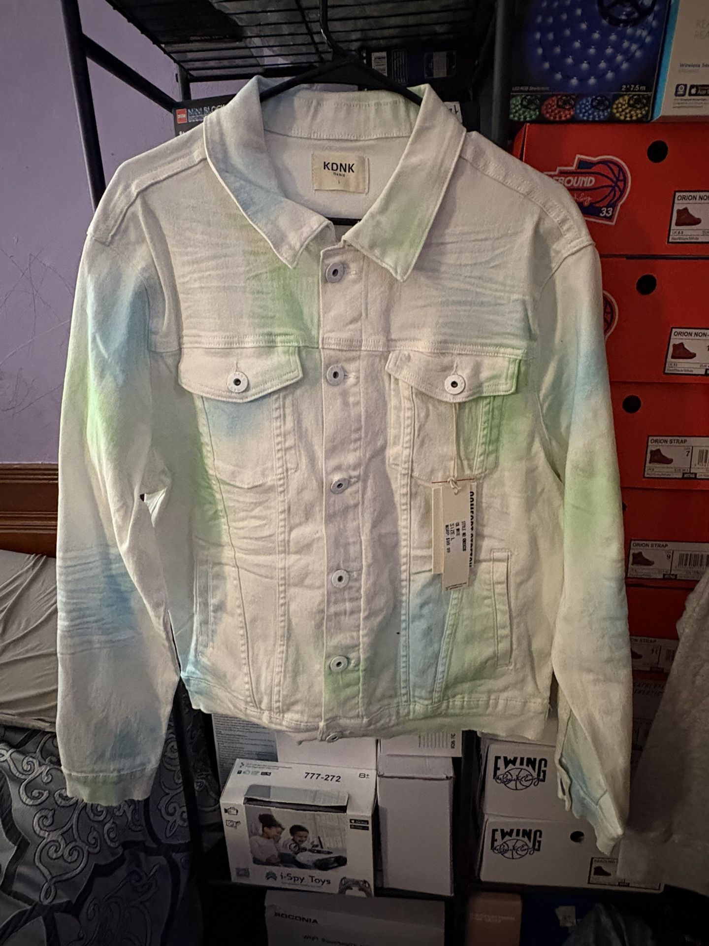 Brand new KDNK denim jacket, size Large, still has the original tags and extra button. Features a clean white base with light green + blue tie-dye wash. Comfort-stretch denim for easier movement and a modern fit. ✔️ New with tags ✔️ Style No: KMD5038 ✔️ MSRP: $99.99 ✔️ Stretch denim ✔️ Men’s Size L ✔️ No stains, no damage Perfect for streetwear, casual outfits, or layering. I have different sizes M L XL