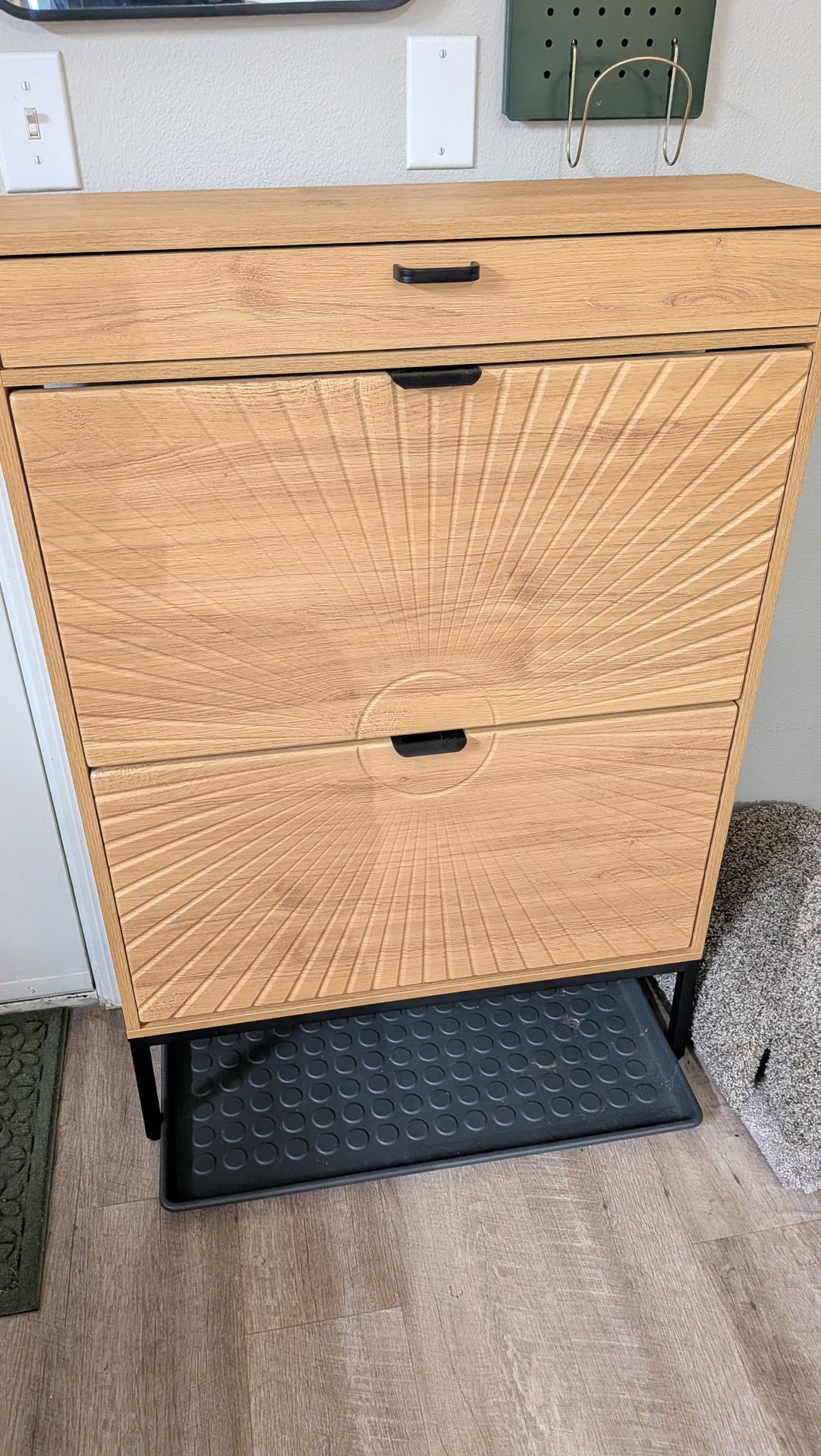 Really nice and unique shoe cabinet. It has a little drawer on it as well which I have loved. I use it as an entryway table. Fits a TON of shoes. Can fit some boots too. Bought for $250 originally. Only had for 6 months.