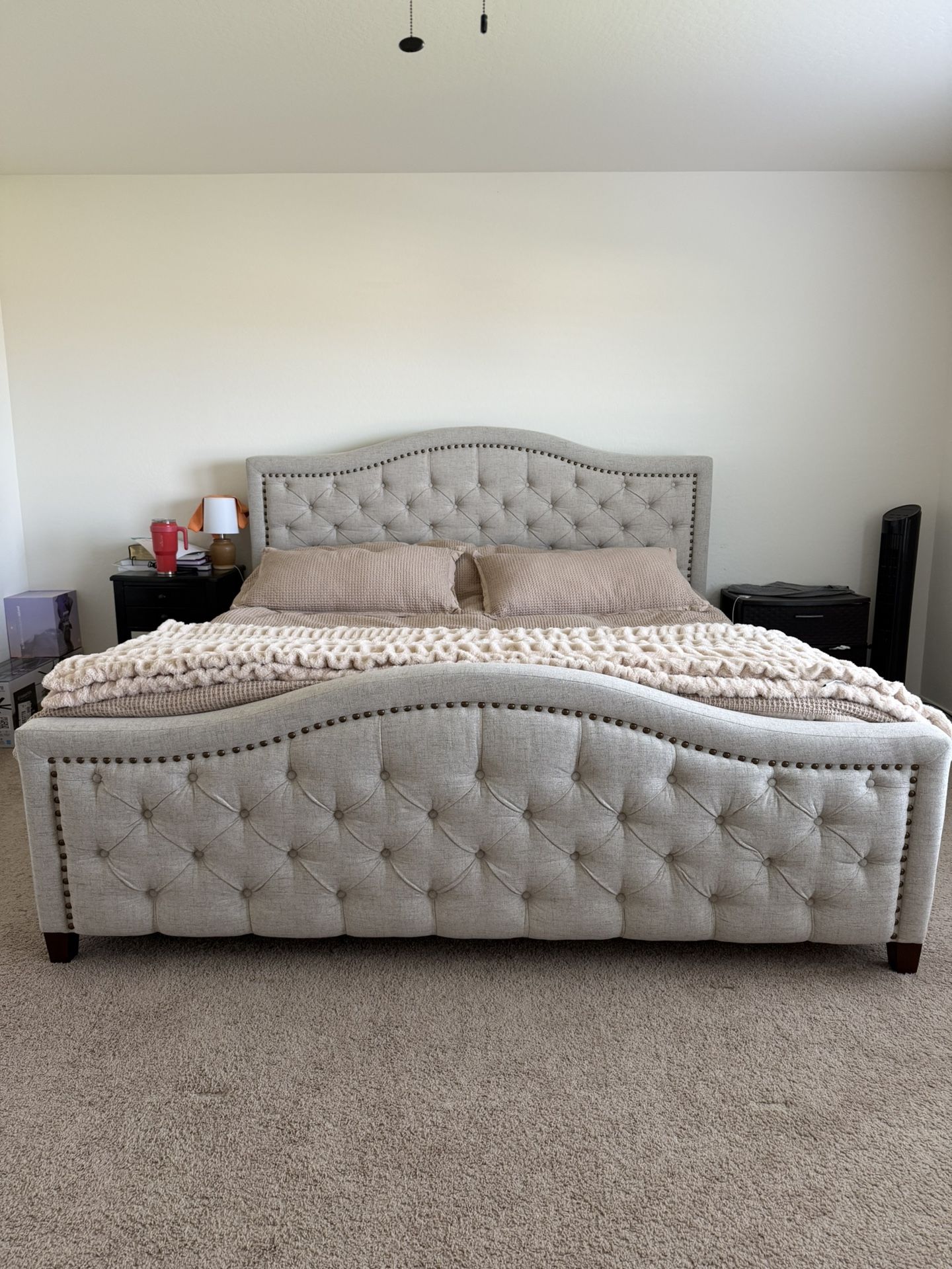 Like new item, looking to update design. No pets or smoking home, no stains. Mattress and pillows not included.