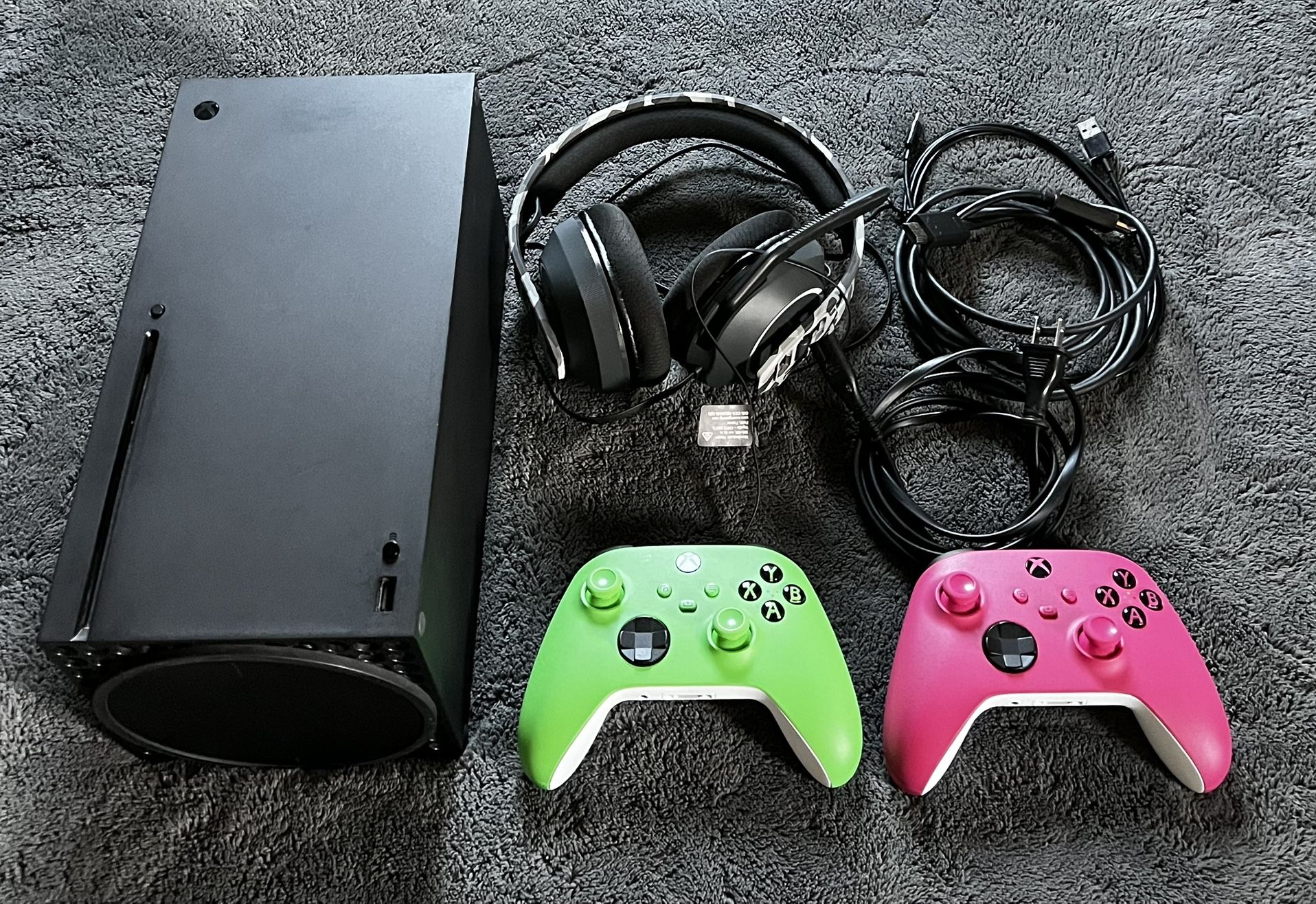 $460 - Selling this Xbox Series X. In excellent condition, works like new. Adult owned. Both Xbox controllers (Neon Pink and Green) are NEW, never used. RIG wired headset in excellent condition. FIRM ON PRICE. Can test, I will set up a monitor. NO TRADES. Comes with: *Xbox Series X *Power Cable/HDMI/Stand *Neon Green Xbox Controller (NEW) w/charger *Neon Pink Xbox Controller (New) w/charger *RIG 400 Wired Camo Headset
