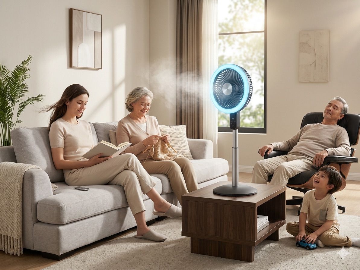 Refresh Your Space Instantly Cool Mist. Total Silence. Ultimate Comfort. Upgrade your home with the Air Circulator. Combining high-velocity airflow with revolutionary cooling mist, this telescopic fan delivers a refreshing breeze exactly where you need it. • Instant Cooling: Advanced mist technology drops temperatures fast. • Whisper Quiet: Ultra-silent operation (under 30dB) for undisturbed sleep. • Fully Adjustable: Telescopic height (65cm–93cm) and remote-controlled ease. • Energy Efficient: Powerful performance with a low-draw 12W motor. Stay cool, calm, and collected. Available in White and Sky Blue.