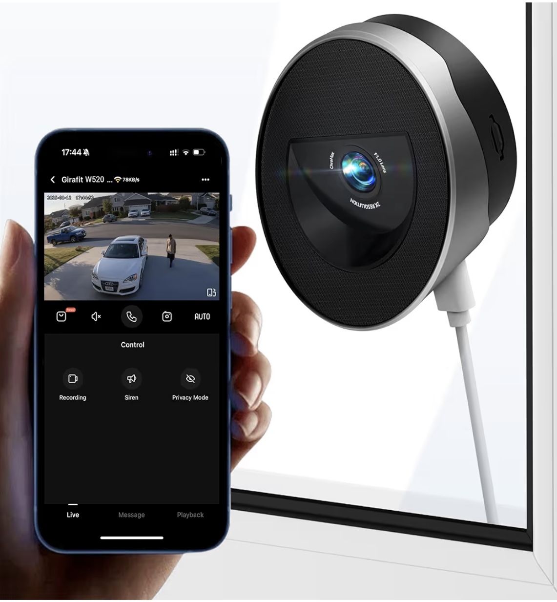Wholesale available 20° Tilt Angle Window Security Camera for Second Floor: Girafit W520 camera is built-in 20° tilt points the view down—so you’ll catch your ground-floor space, car clearly. Deliver a wide-angel view that covers every corner, ensuring complete protection withour missing a single detail. ChroMax AI Color Night Vision With 2K QHD: Girafit exclusive ChroMax AI sensor captures 20X more light than normal cameras under equivalent ambient light conditions.Recognizes nighttime conditions in advance and helps react in time. AI Human Detection & Hexagonal Zone Detection: Shape the hexagon to your L-corridors, angled driveways, or garden curves—no more wasted coverage. Plus human detection ignores distractions like swaying branches, ensuring you only get alerts when someone’s there. 99% fewer annoyances, 100% peace of mind. Effortless Setup for All: Say goodbye to complicated installations. No tools needed—just peel, stick, and connect via Bluetooth. Easy to Install for everyone, setup takes under a minute. US Cloud Storage & SD Card Storage: Girafit security camera supports encrypted cloud storage in the US and a built-in micro SD slot up to 256GB; ensuring your high-quality 2K day and night color footage is safely stored locally or in the cloud. Bank-level encryption shields data; no leaks, ever.