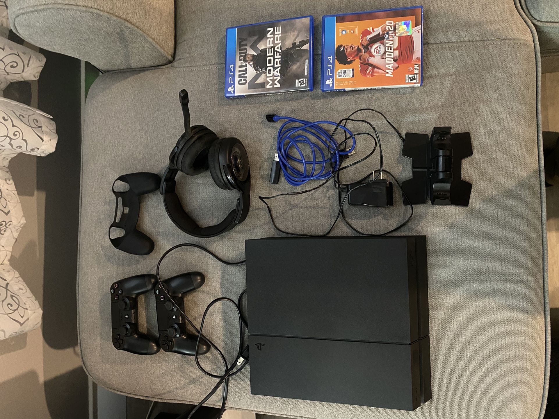 PS4 bundle!!! PS4 was hardly used. Never had time to play. Games are brand new. Never played. Wireless headset. Two wireless controllers with one protective sleeve. One dual controller charging station.