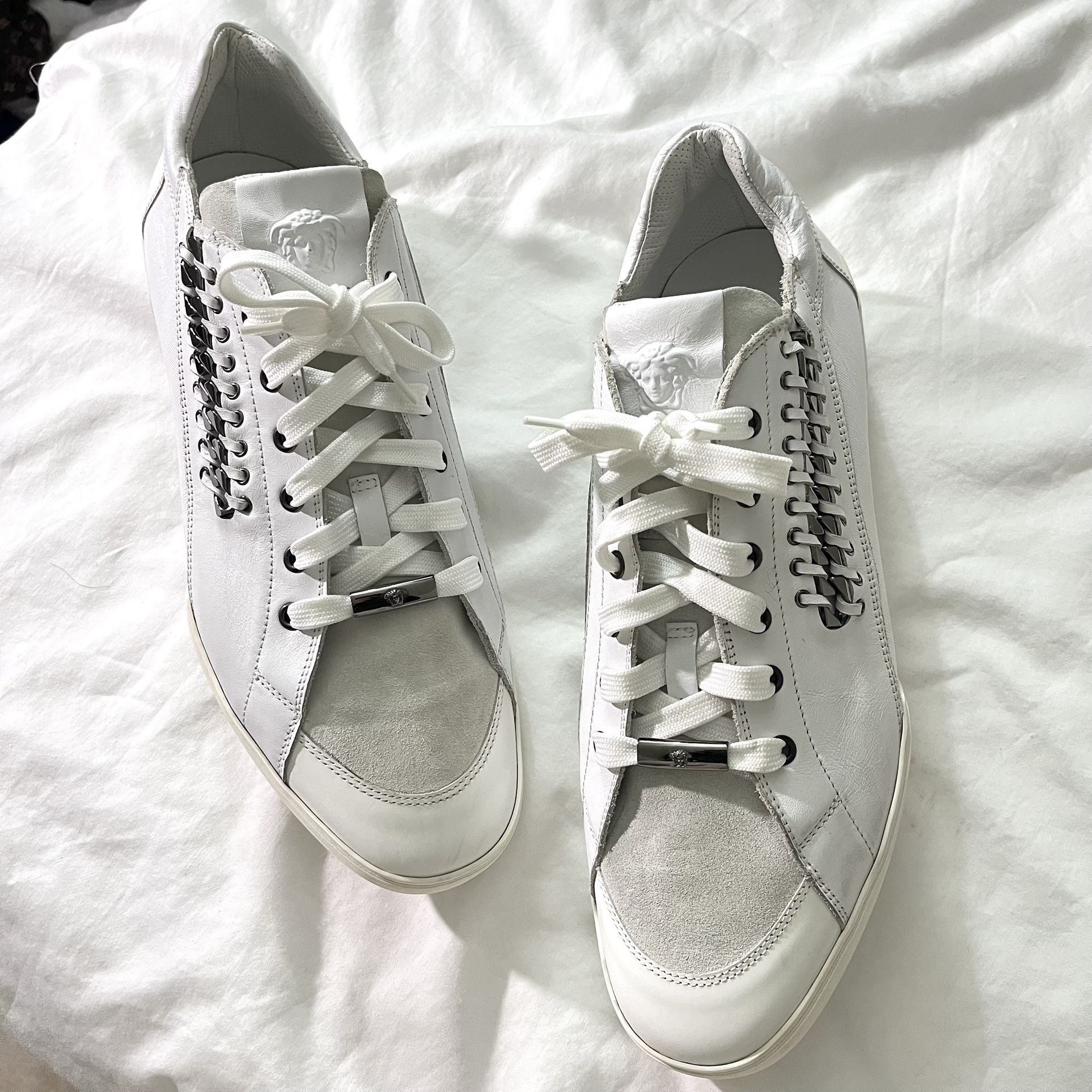 Versace Men’s Medusa Chain Sneakers Off‑White Leather Suede Size 45.5 Designer