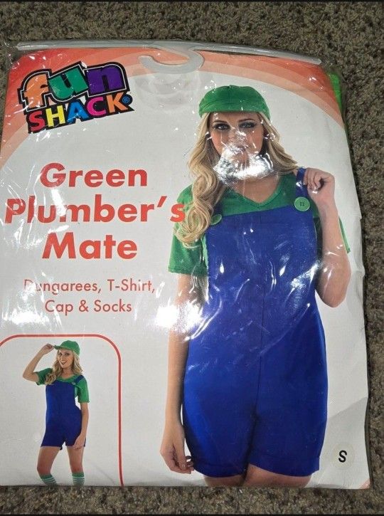 Fun shack Green plumber Like Luigi costume Women Size Small Brand New Comes with ▪︎ Bib/ overalls shorts ▪︎ t shirt ▪︎ cap/ hat ▪︎ socks / long leggings Dress up costume Halloween ●●●● Luigi ❤️🧡