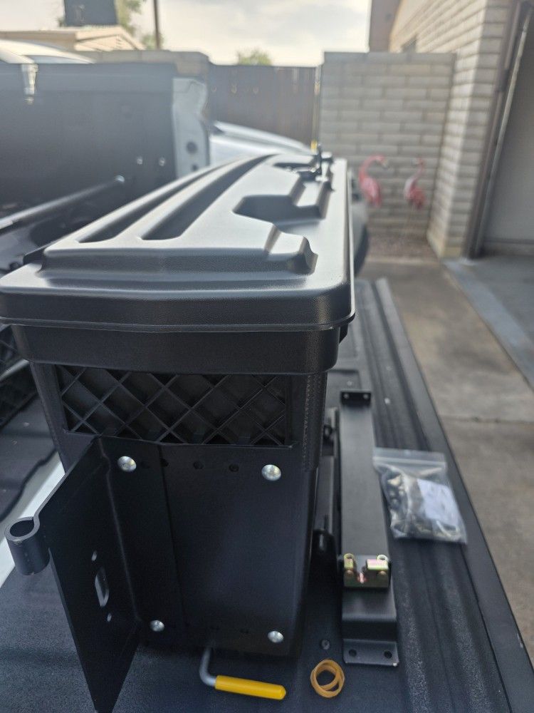 This item is a YHTAUTO Lockable Truck Bed Storage Box. Design: Features a swing-out mechanism pivoting nearly 180 degrees for tailgate access. Features: Constructed from waterproof materials and includes a locking lid to secure tools. Dimensions: Measures approximately 30.71 inches long, 9.06 inches wide, and 15.35 inches high. Compatibility: Fits specific wheel well areas on models like Toyota Tundra or Dodge Dakota, depending on the part number.