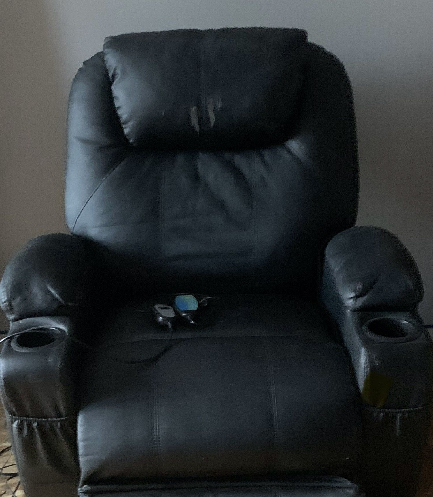 Reclining heat & massaging chair, black in color, has wear & tear. On the second floor, need two people to bring it down. No delivery. If listed it’s available. Quick pick up! Thanks for viewing.