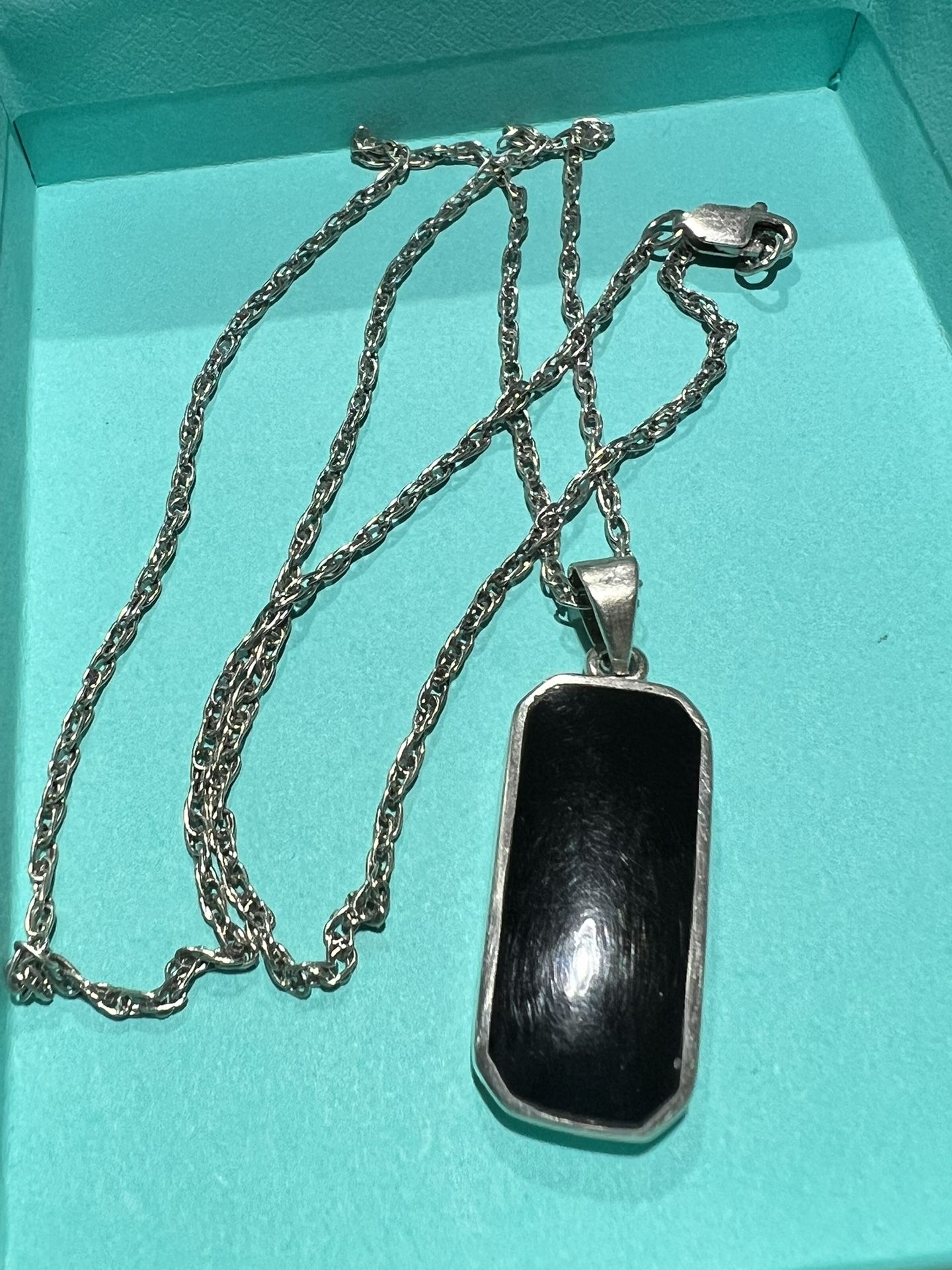 PURE STERLING SILVER NECKLACE WITH A BLACK STONE PENDANT SIZE 20 INCHES LONG