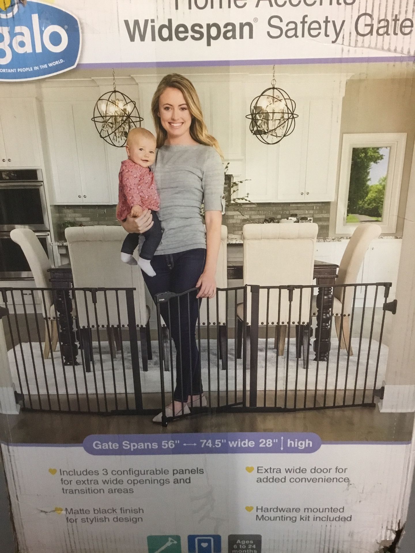 Baby or pets gate super wide 74.5 inches wide adjustable with nice door walk through door