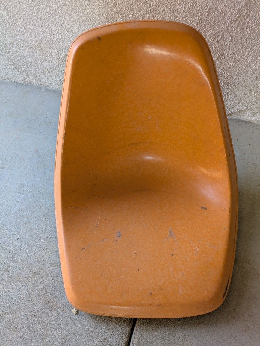 I have a bunch of orange fiberglass eames style chairs. Price is per chair. These came out of a bowling alley in San Bernardino I was using them to make benches but have just sat idle on these for too long. They are sturdier than eames chairs. All in great condition . Last picture is one way you could use them. Eames herman miller mid century modern MCM fiberglass chair Eiffel base rocker base dwr