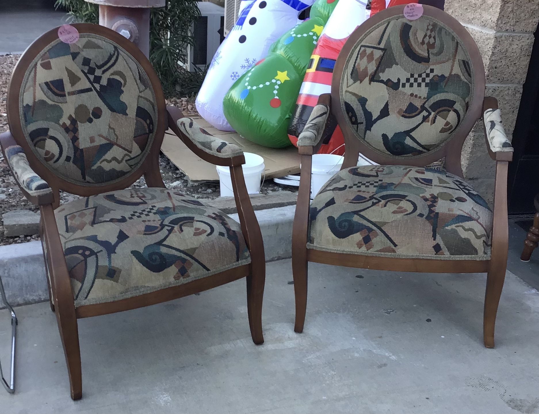 38.75 in. x 29 in. x 27 in. chairs with dark brown wood frames and patterned cushion, 2 available for $45 each. All sales are final, no returns, exchanges, or refunds