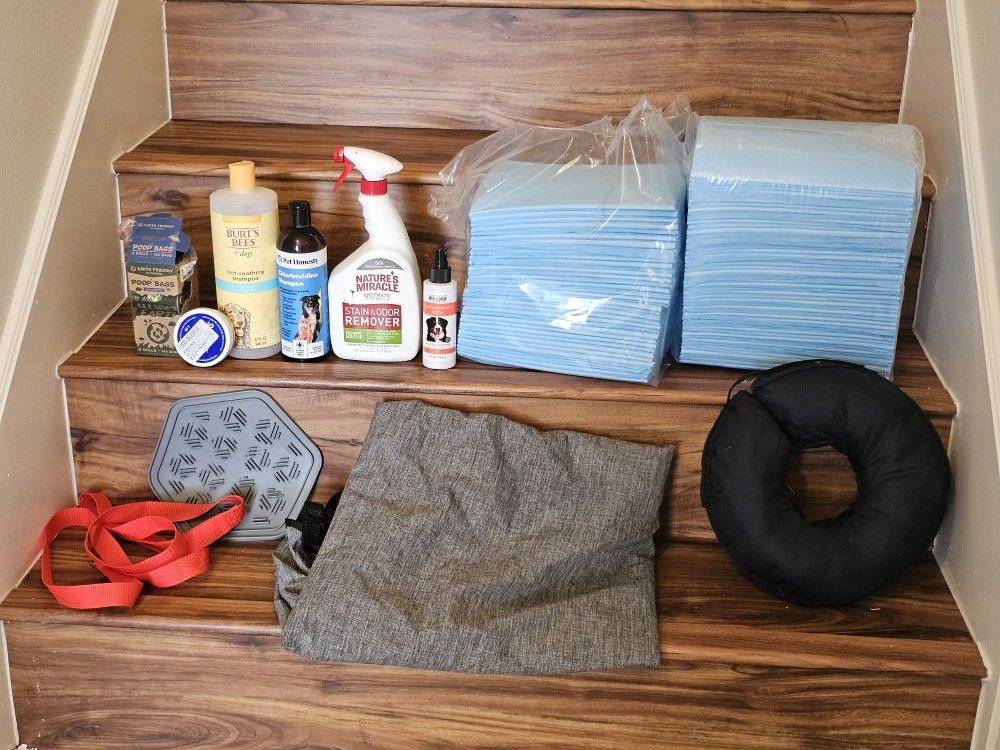 Includes pet gate, pee pads, chlorhexedine shampoo (almost full), pet stain remover, lick mat, poop bags, paw cream, and inflatable collar. Take all for $50 or best offer for specific items.