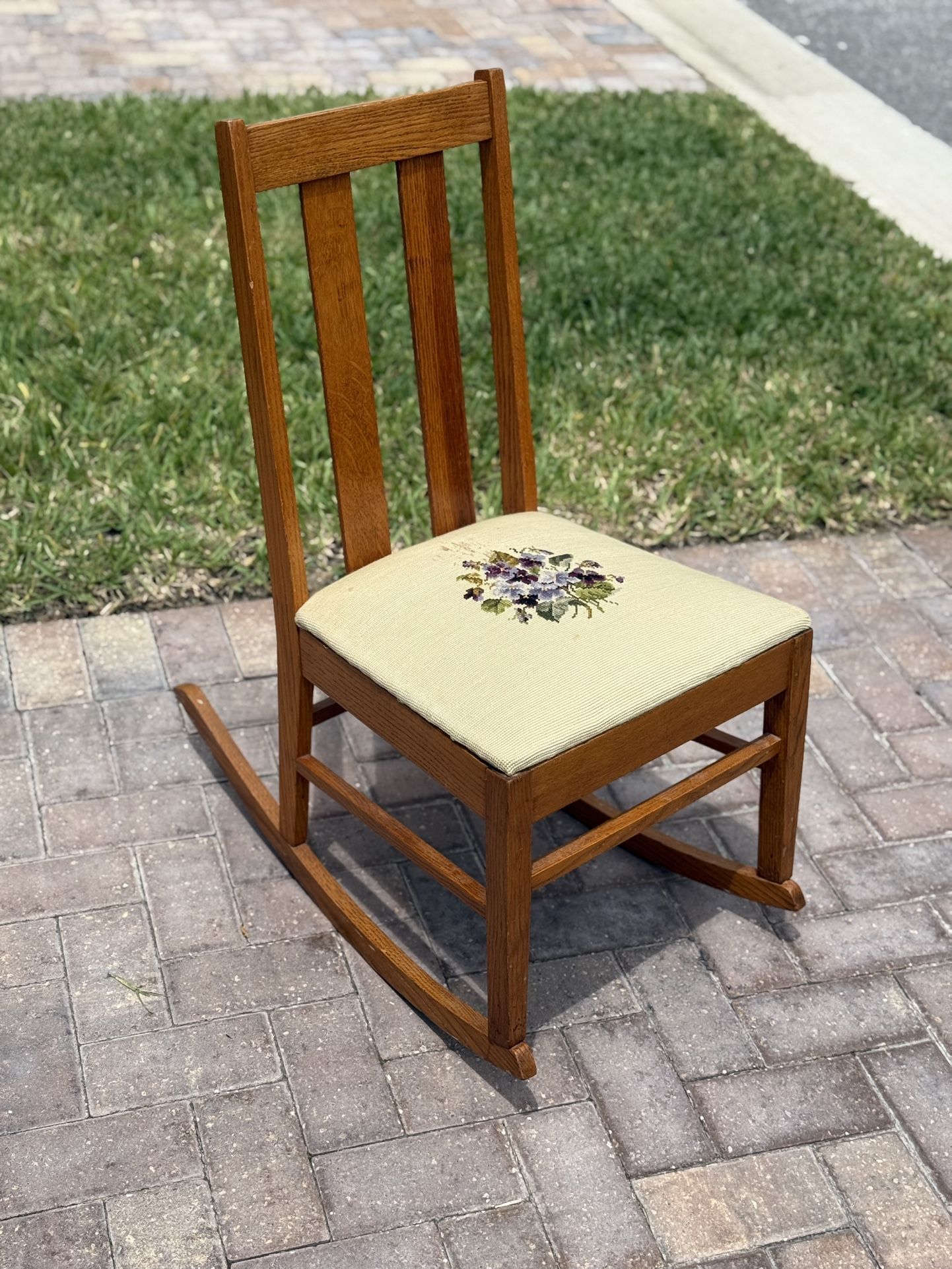 Beautiful vintage wooden rocking chair in the classic Mission / Arts & Crafts style. Solid wood frame with clean, straight lines and timeless design. The seat features a hand-embroidered floral design (violets), giving this piece unique charm and character. Features: • Solid wood construction • Mission style vertical slat back • Comfortable rocking base • Unique hand-embroidered floral seat cover • Perfect for home decor, reading nook, nursery, or as a collector’s piece Condition: Good vintage condition with minor signs of age. The seat upholstery is not original, but the hand embroidery makes it truly one-of-a-kind. Seat fabric will need cleaning. Price: $100 Pickup in 32092