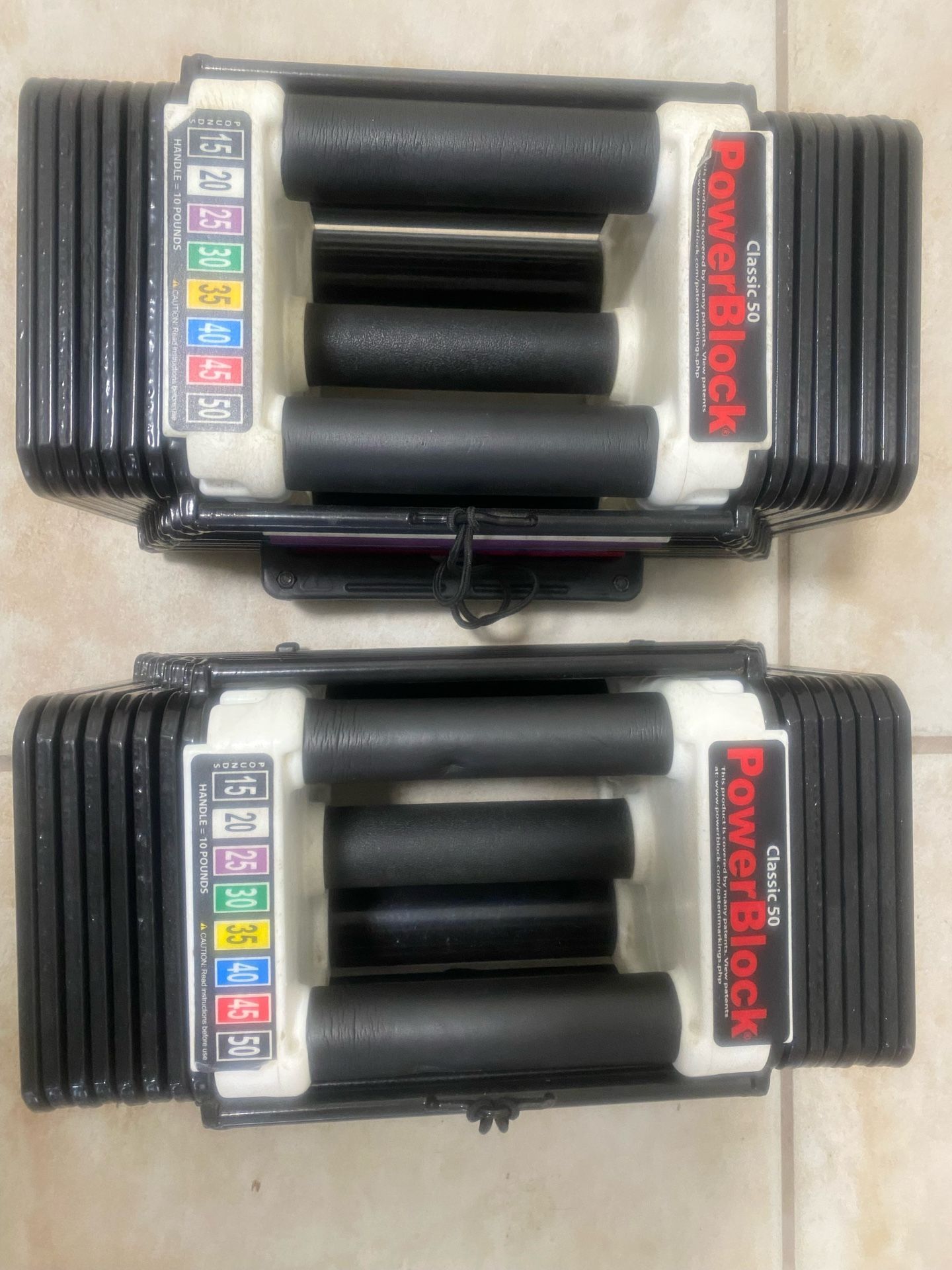 PowerBlock Adjustable Dumbbells up to 50 pounds. If interested please call or text (contact info removed)