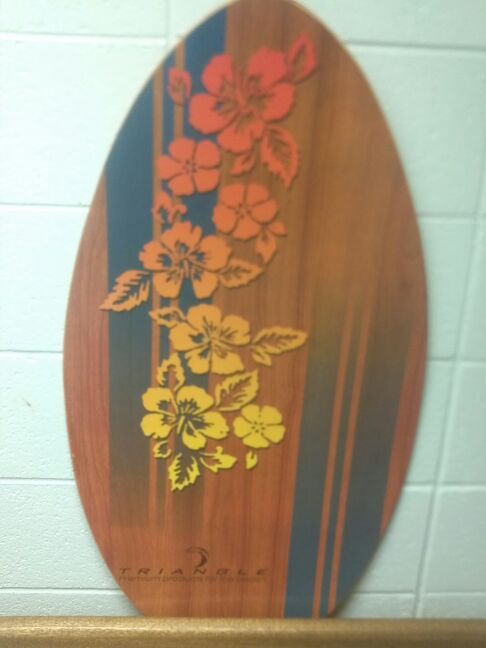 This skimboard, by Triangle Premium Products for the beach, measures 36 and a half inches long by 20 wide. It is in nearly new condition.