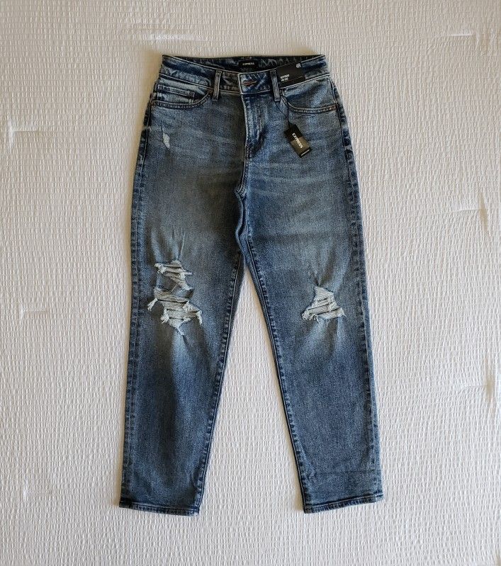 NWT! EXPRESS Women's Boyfriend Mid Rise Ripped Stretchy Jeans (4R/27) Acid Wash