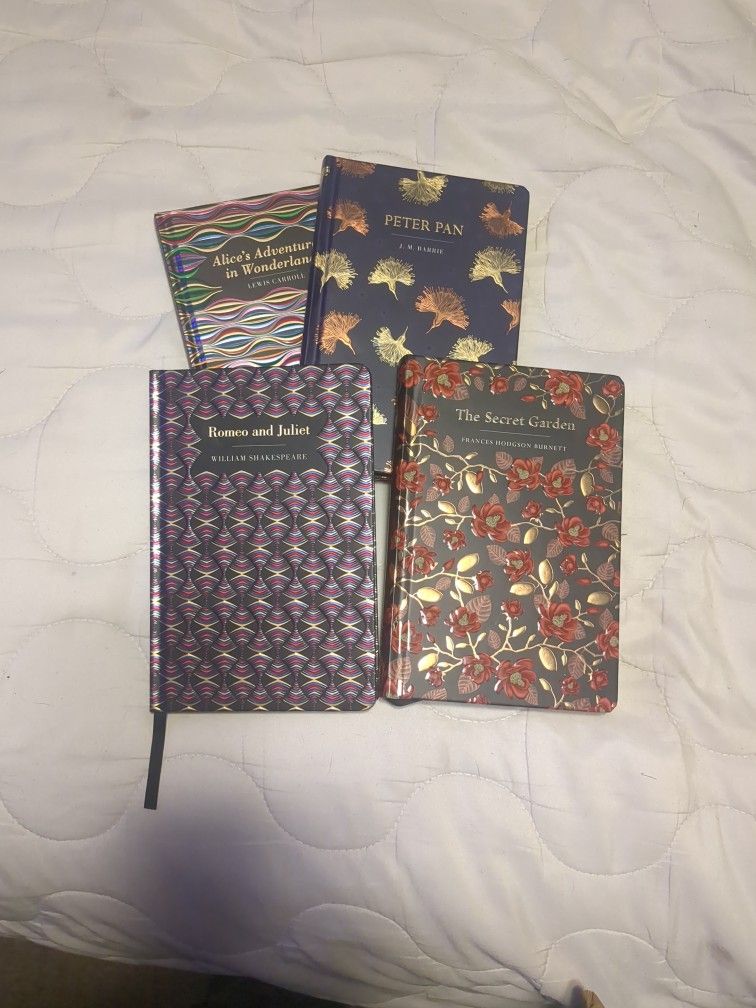 Alice's Adventures in Wonderland, by Lewis Carroll. Peter Pan, by J.M. Barrie. The Secret Garden, by Frances Hodgson Burnett. Romeo and Juliet, by William Shakespeare. All are in brand new condition. $50 for all 4 books.