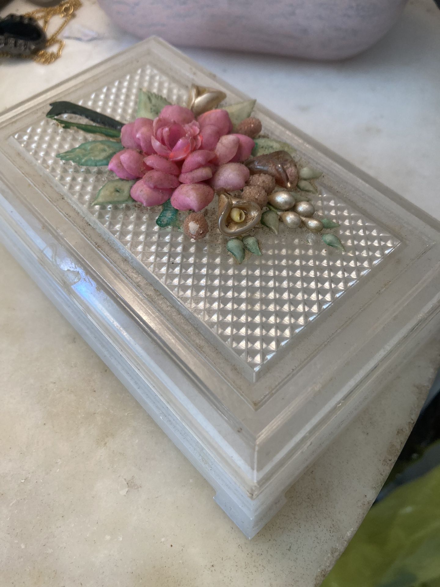 6.25” x 4.5” marbled white w/ a Fushcia raised lid design w/ faux pearls vintage greAt for jewelry etc 2940s-40s