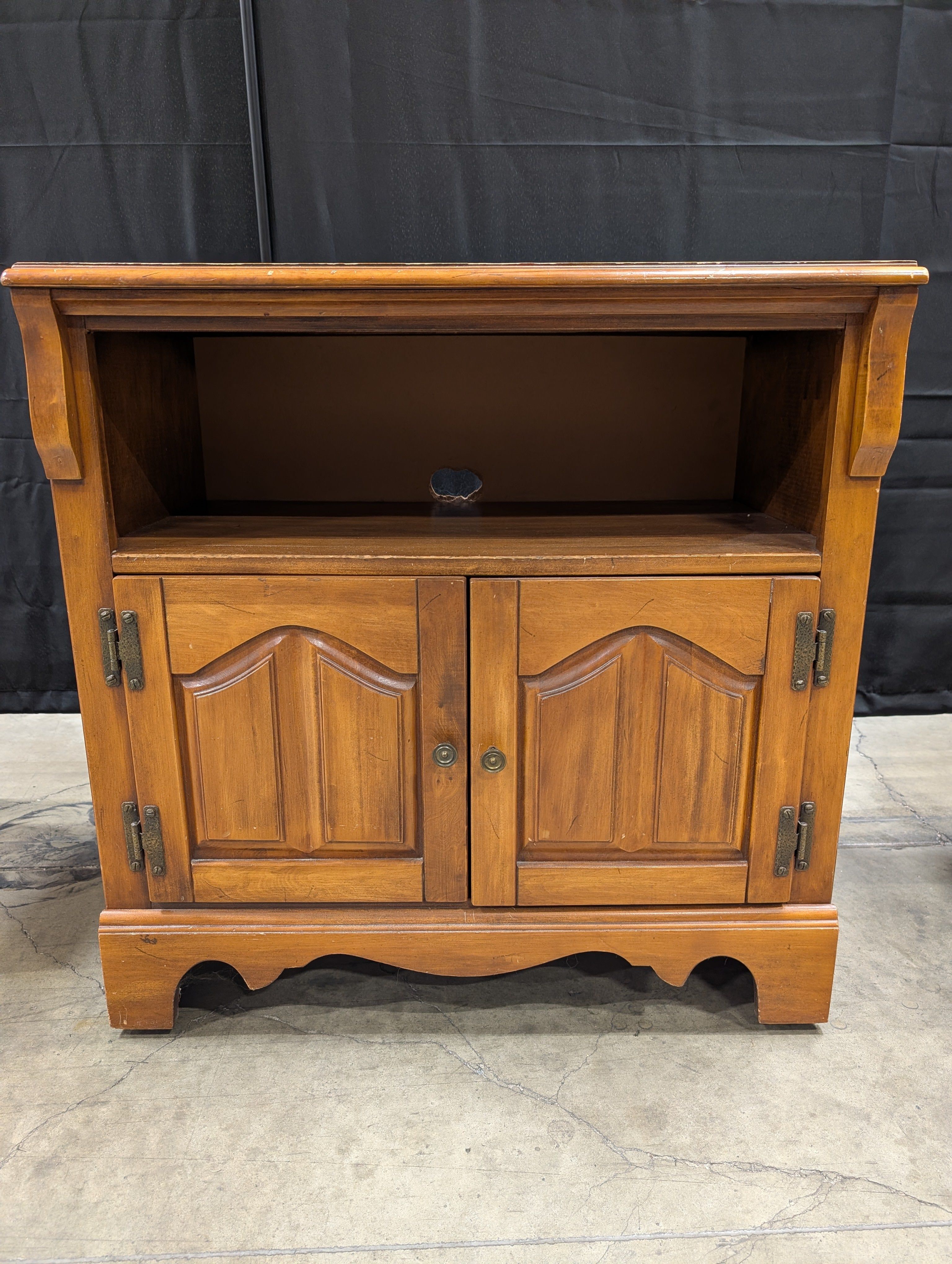This is a wooden console cabinet with a warm brown finish. It features a flat top surface and an open storage shelf. The lower section includes two cabinet doors with decorative panels and metal hardware.