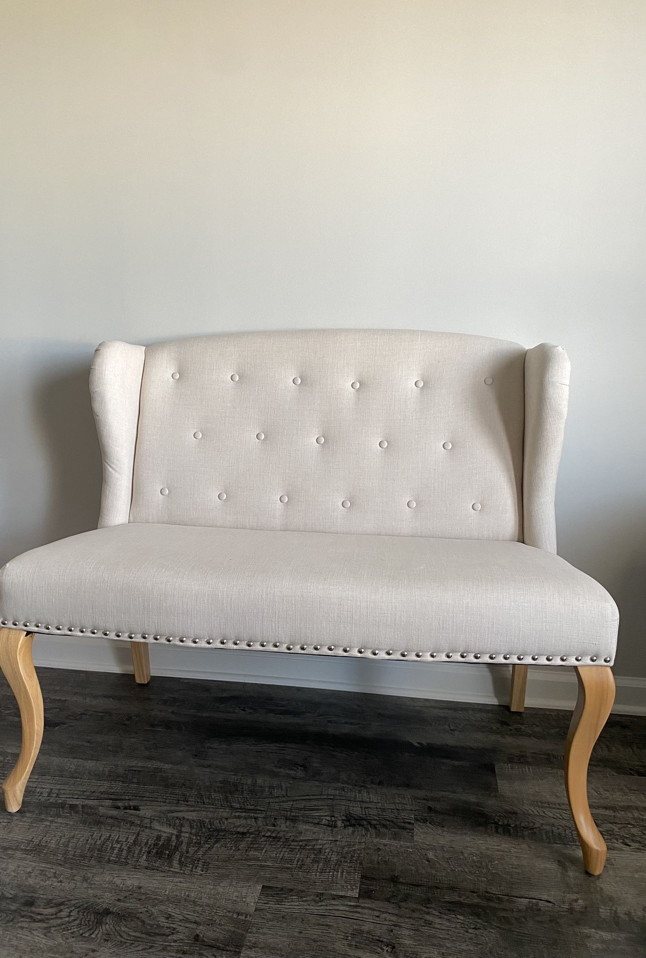 Eva French Country Style Tufted Beige Fabric Wingback Bench /loveseat •CONTEMPORARY DESIGN •WINGBACK DESIGN •BUTTON TUFTED WAFFLE STITCH •NAILHEAD ACCENTS •QUEEN ANNE RUBBERWOOD LEGS Material: Fabric Leg Material: Rubber Wood Color: Natural Plain Leg Finish: Natural Hand-Crafted Details Dimensions: 28.50 inches deep x 43.50 inches wide x 36.25 inches high Seat dimensions: 18.25 inches deep x 43.50 inches wide x 20.75 inches high Condition: good / like new