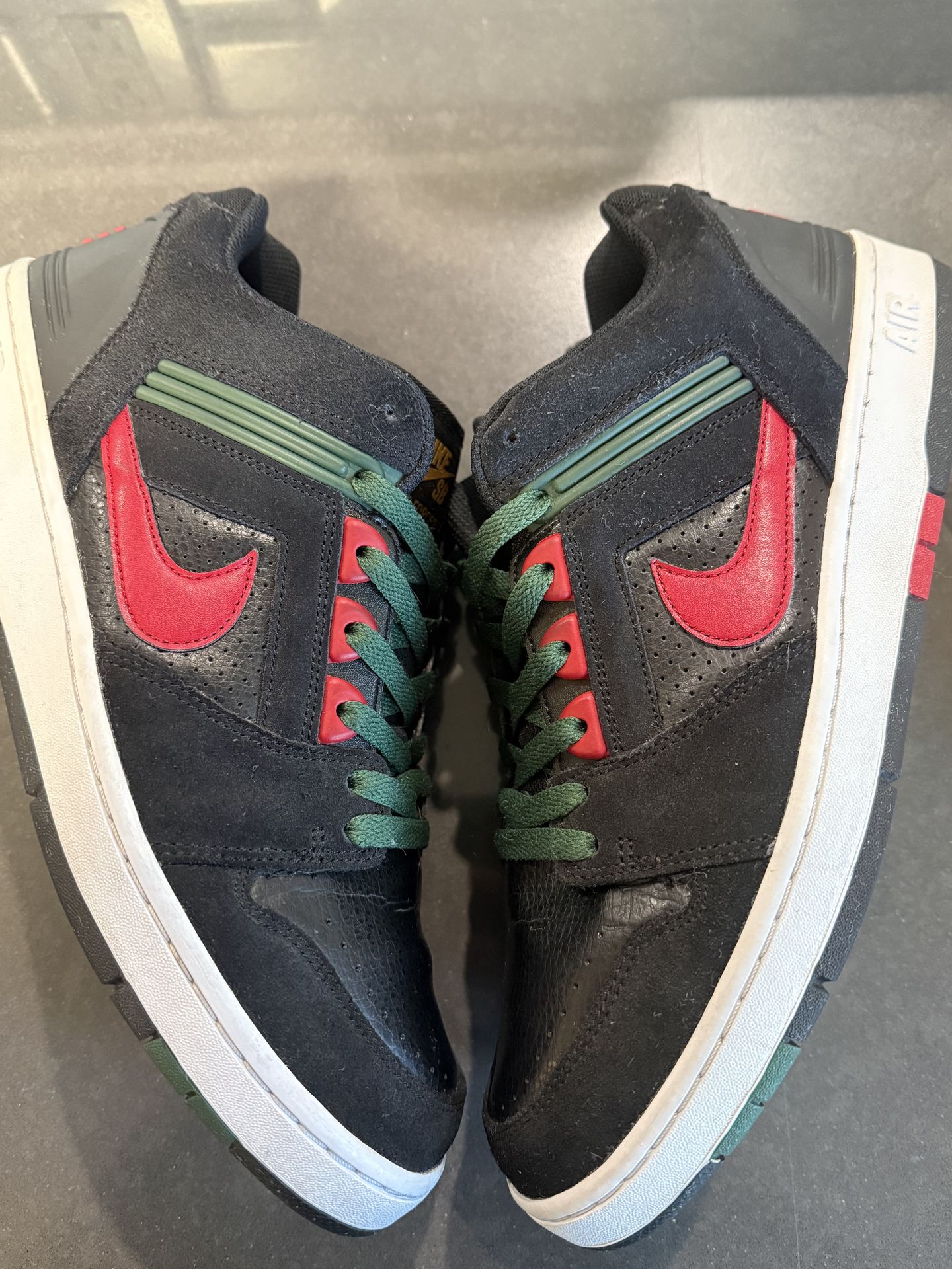 No box in good condition. The Nike SB Air Force 2 Low Black Gucci is a collaboration skateboarding shoe that was designed by Nike and the fashion brand Gucci.