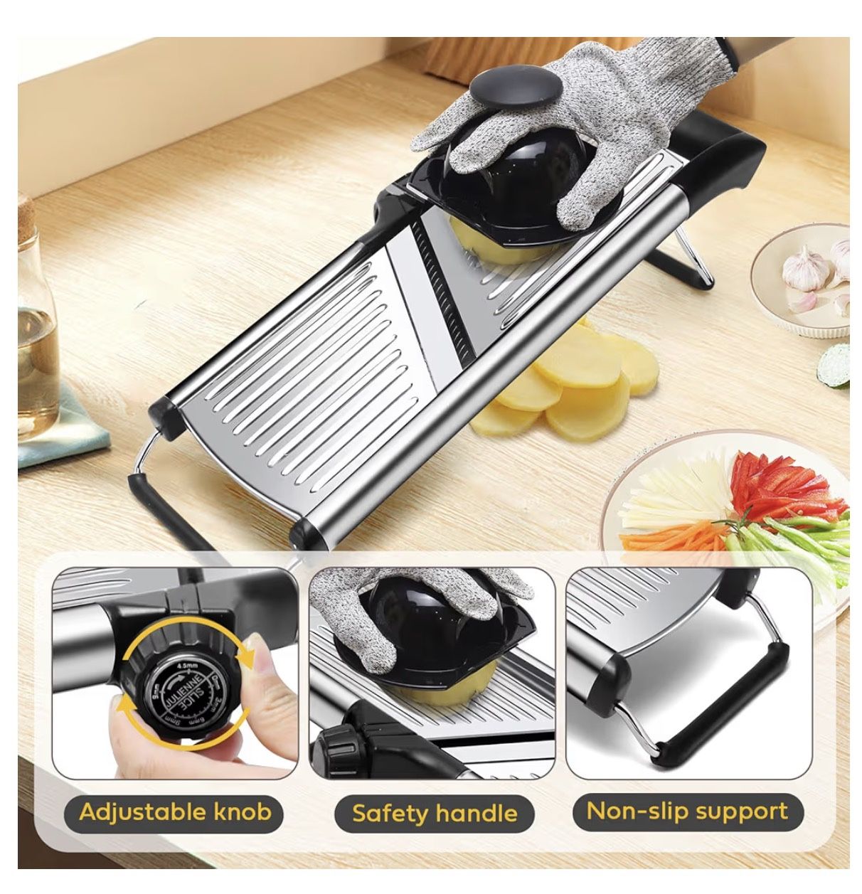 New in box Brand XGDVBVM Product Dimensions 16.49"L x 7.1"W x 3.2"H Material Stainless Steel Color Stainless steel primary color Special Feature Interchangeable Blades Recommended Uses For Product Vegetable Adjustable mandoline slicer: The slice thickness freely controllable from 0 to 9mm made by the Mandolin slicer.The slicing mode (0.45mm / 0.9mm) can be easily switched,easy to achieve thick silk, fine silk, thin, thick and other diversified modeling, Professional Mandolin - Upgrade your cooking skills! Multi-function vegetable slicer: The mandolin can be used as a cucumber slicer, potato slicer, tomato slicer and onion slicer.Easily handle hard fruits and vegetables as well as soft ingredients,, to meet the slicing, slicing, dicing, wave cutting and other needs, suitable for salad, hot pot, baking and other scenes. Mandoline Accessories Set: Equipped with professional anti-cutting gloves to avoid operation accidents; Safe mandoline slicer for kitchen with a multi-functional paring knife and small brush, from pre-treatment to fine cutting to cleaning and storage in one step, improve kitchen efficiency. High quality stainless steel material: The main body is made of stainless steel, vegetable slicer strong corrosion resistance and not easy to rust, the mandoline food slicer blade is processed by precision technology, durable sharp to ensure efficient cutting, while meeting the kitchen hygiene and safety standards. Convenient cleaning design: The blade assembly can be removed quickly, and the stubborn residue can be easily handled with the included cleaning brush; The main body supports dishwasher cleaning, no need to bother wiping, saving time and effort more hygienic.