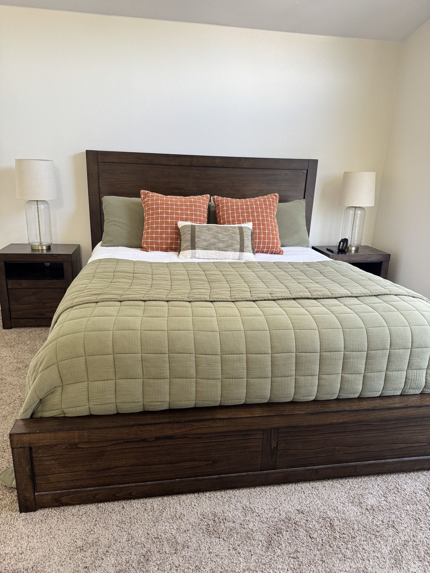 Beautiful solid wood bedroom set in a rich dark finish. Includes a California King bed frame (headboard, footboard, and side rails), matching nightstands, and a dresser. Features: • Headboard with built-in USB charging ports on both sides • Matching nightstands with cord grommets for easy cable management • Spacious dresser with top two drawers lined in velvet • Sturdy, high-quality solid wood construction Condition: Great condition with minimal wear. Selling due to move. Dimensions: • Dresser: 62” L x 16.5” D x 36” H • Nightstands: 22” L x 16” D x 25” H • Bed frame: 80” L x 93” D x 56” H (headboard height) Additional info: • Mattress not included • Must be able to transport • Cash only Price: Make your best offer
