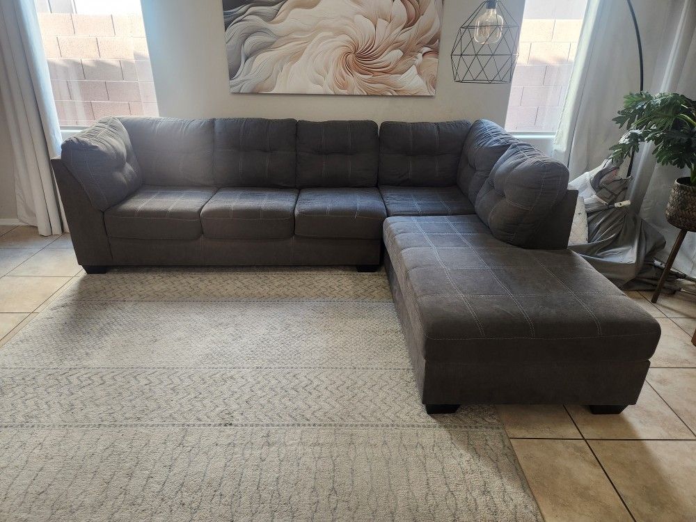 Grey Sectional. 87" D x 114" W. Has some frayed seams. Will be washed before pickup.