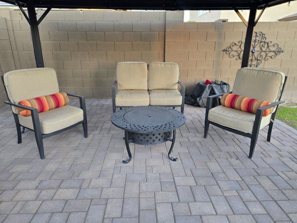 WROUGHT IRON OUTDOOR PATIO SET EXELLENT USED CONDITIONS WITH SUMBRELLA CUSHIONS AND 2 DECORATIVE PILLOWS & FIREPIT TABLE **FOR BURNING WOOD **$550 DELEVERY AVAILABLE AROUN 15 MILES OF MY AREA CITRUS AND LOWER BUCKEYE
