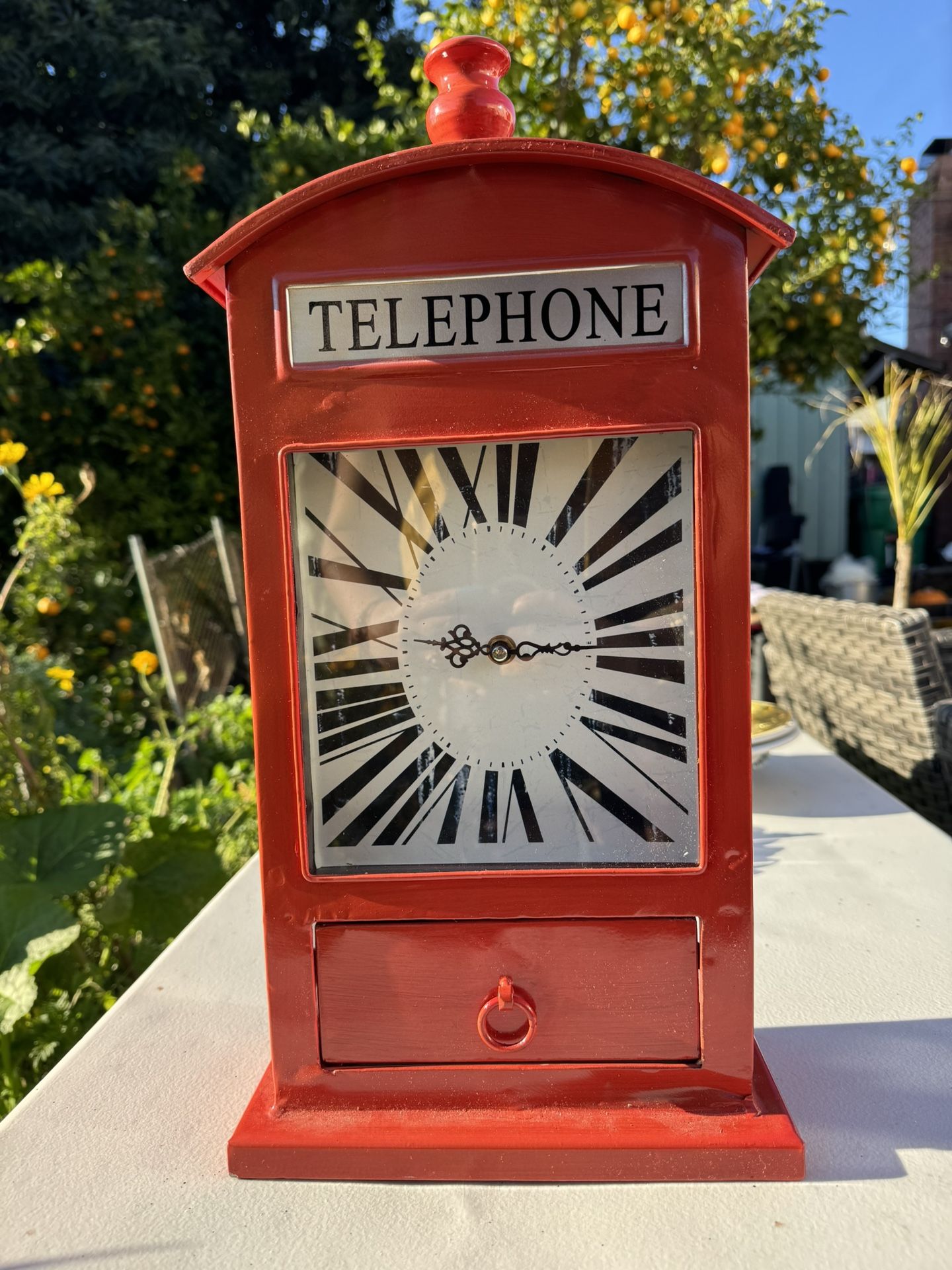 This is Pier 1 red London themed statement clocked originally 49.99. In working condition and comes with a battery. Has a little drawer for misc things. $10 or OBO