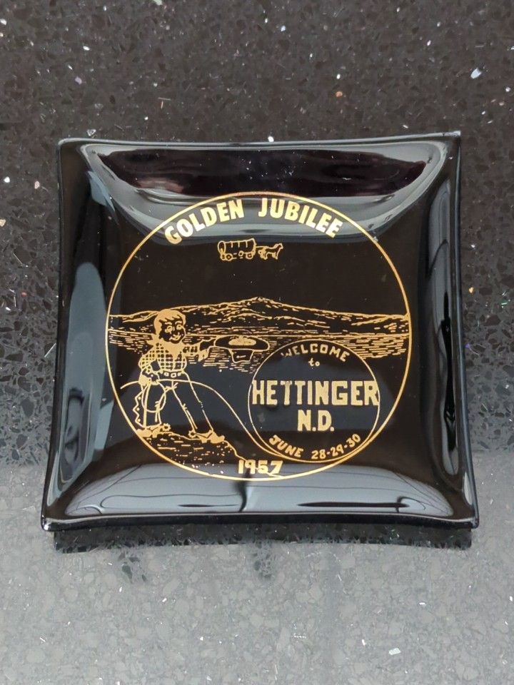Vintage 1957 Golden Jubilee Hettinger Ashtray Trinket Tray North Dakota Glass, beautiful shape. Measures 3.75" x 3.75". Pickup only