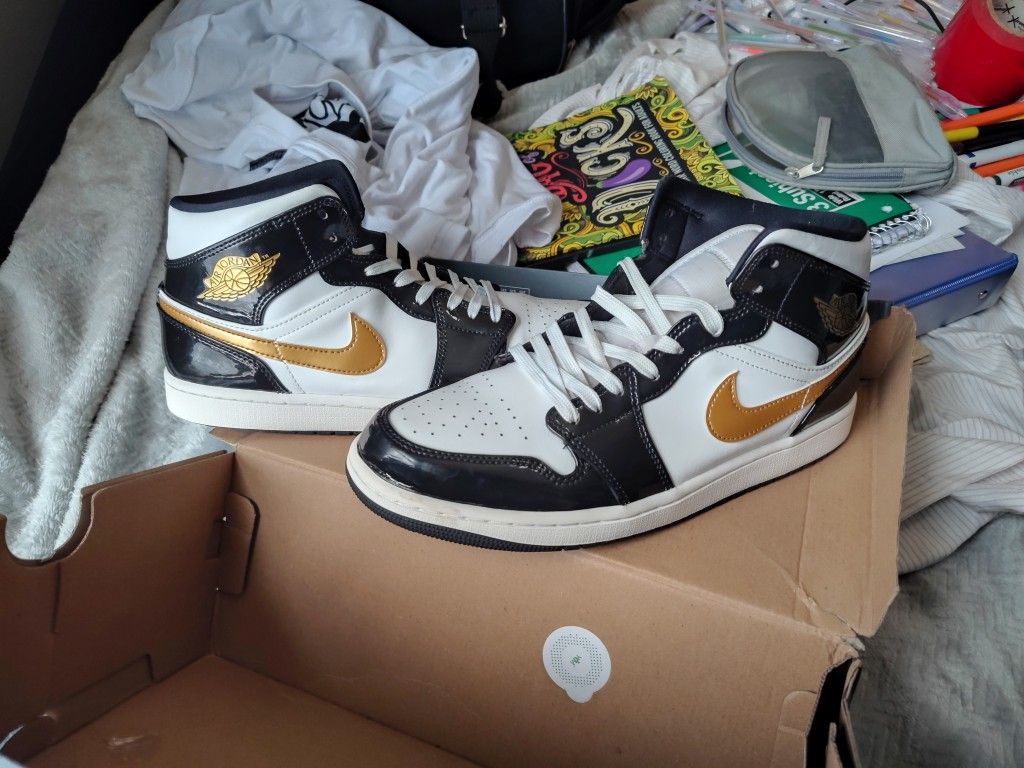 Features black & white patent leather upper with striking metallic gold accents. Includes an encapsulated Nike Air-sole unit in the heel for cushioning & comfort. Released December 2018-January 2019. Original Price: $140.00 Only asking $60.00 Only worn 3 times & they're still in amazing condition inside & out. Small black spot on the right shoes laces but no creases & great shape.
