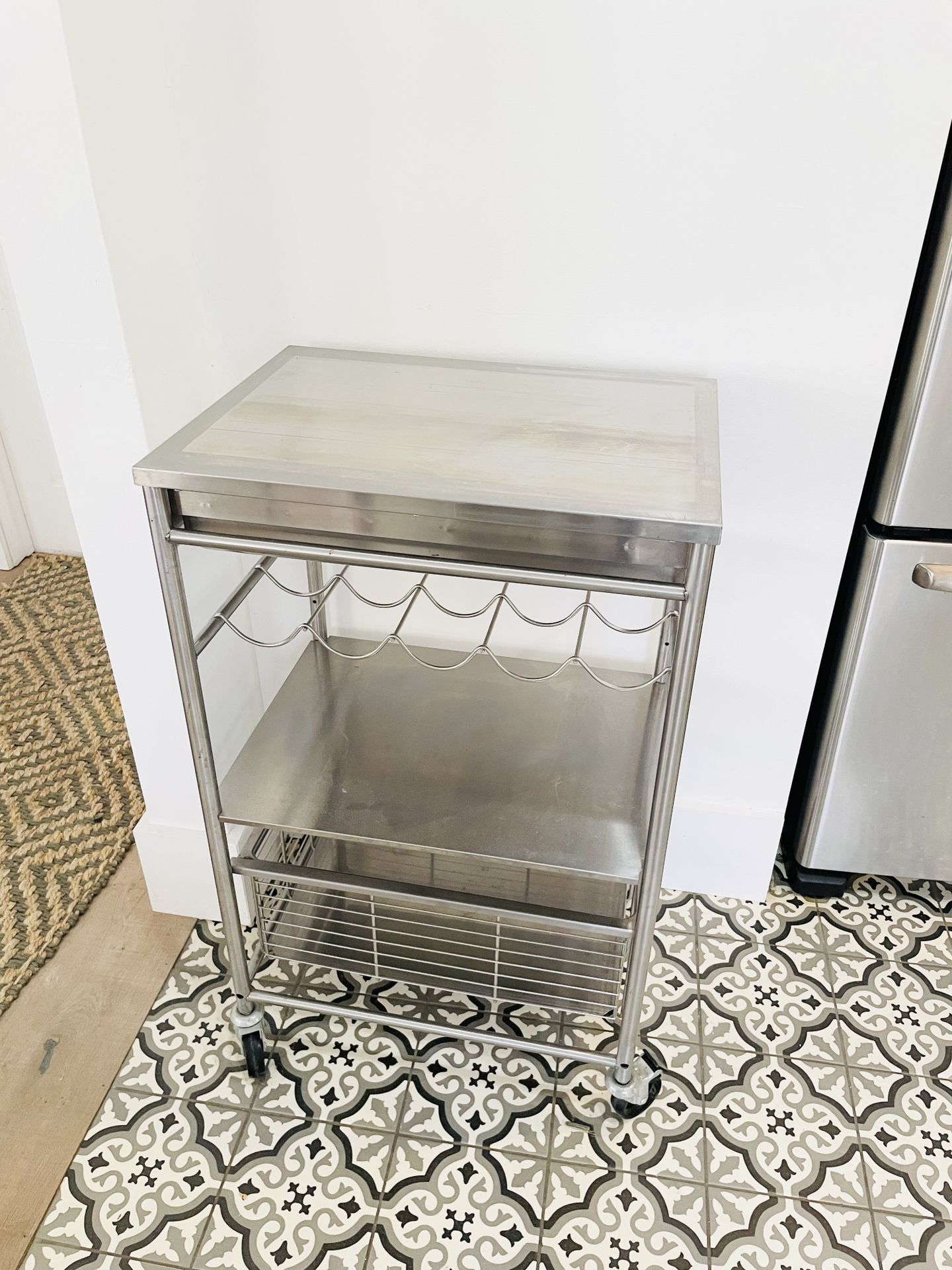 Stainless steel rolling bar or kitchen cart/ wine rack. 2 pull out shelves, bottle rack, rolling wheels. Excellent condition, smoke/pet free home. All accessories and furniture available for purchase separately- pls check other listings. Cash/pickup only Miami 33138 Pottery barn restoration hardware CB2 crate and barrel RH PB article Arhaus hearth and home Studio McGee magnolia side tables chairs living room bedroom kitchen dining bathroom storage console credenza media stand bar stools