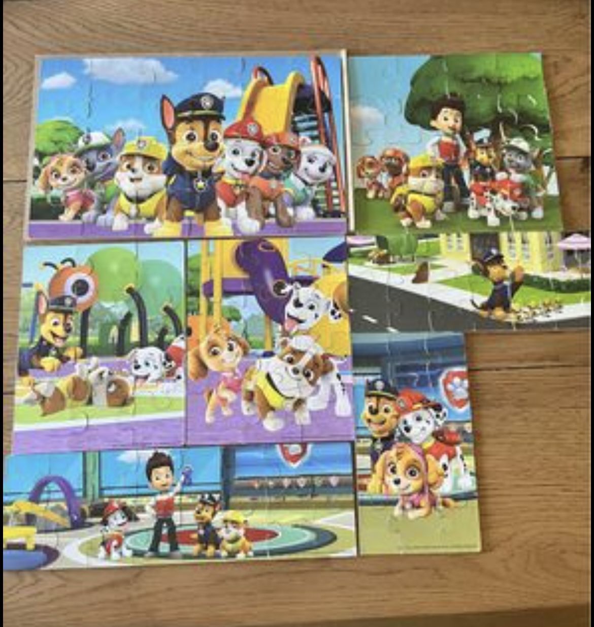 Multiple puzzles, there is a box of paw patrol puzzles, two animal puzzles, alphabet puzzle, color wheel puzzle and a puzzle rack. Selling these as a bundle no individual sales.