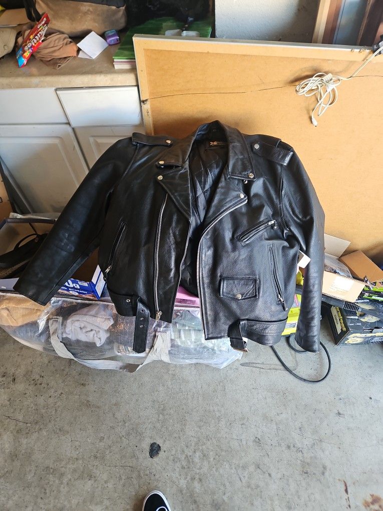 An old leather jacket that I have that's in really great condition. My dad gave it to me but i don't really talk to my family anymore and don't want it. XXL but fits like an XL. I wear large typically and it fits me pretty loose but im not a very large person.