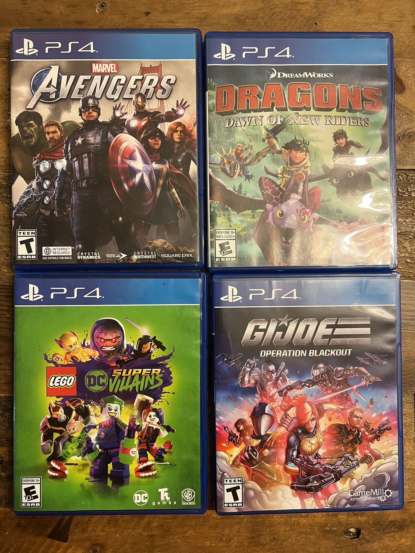 4 used PS4 video games in great condition Avengers, DC Super Villains, dragons dawn of New Riders, and GI Joe