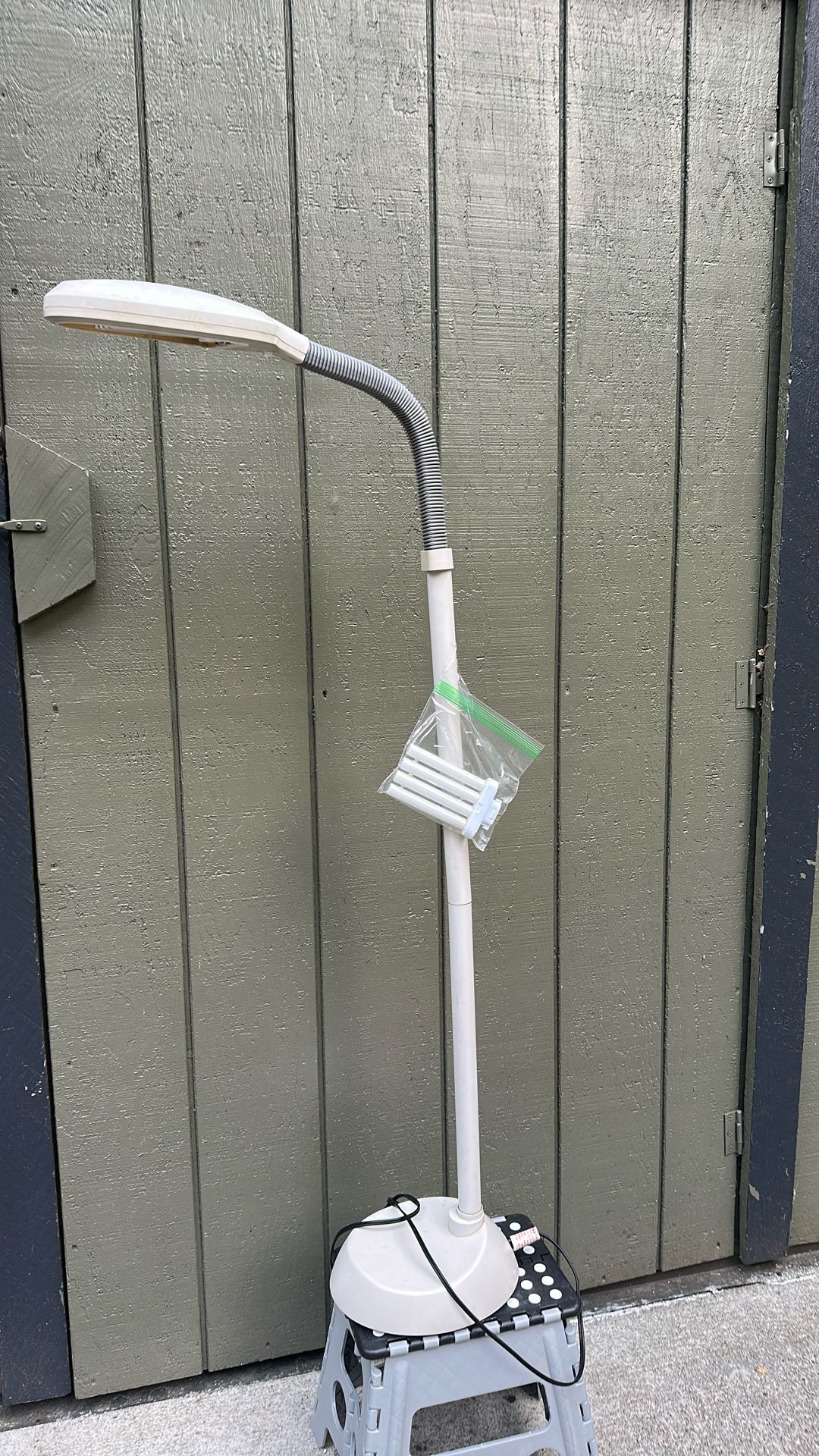 Ott light, fluorescent bulb. Great for crafters or sewing or reading. 4’ tall. Adjustable neck. Has extra bulb. Some discoloration from use, but works great.
