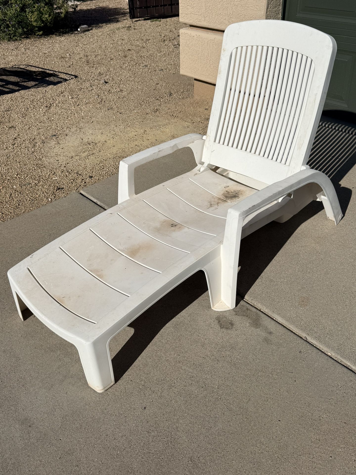 Grosfillex White Plastic Patio Pool Adjustable Chaise Lounge Chair Fair physical condition; There is a slight crack in one of the chair panels Refer to the pictures for item condition Located for pickup around 67th ave and Bell Rd