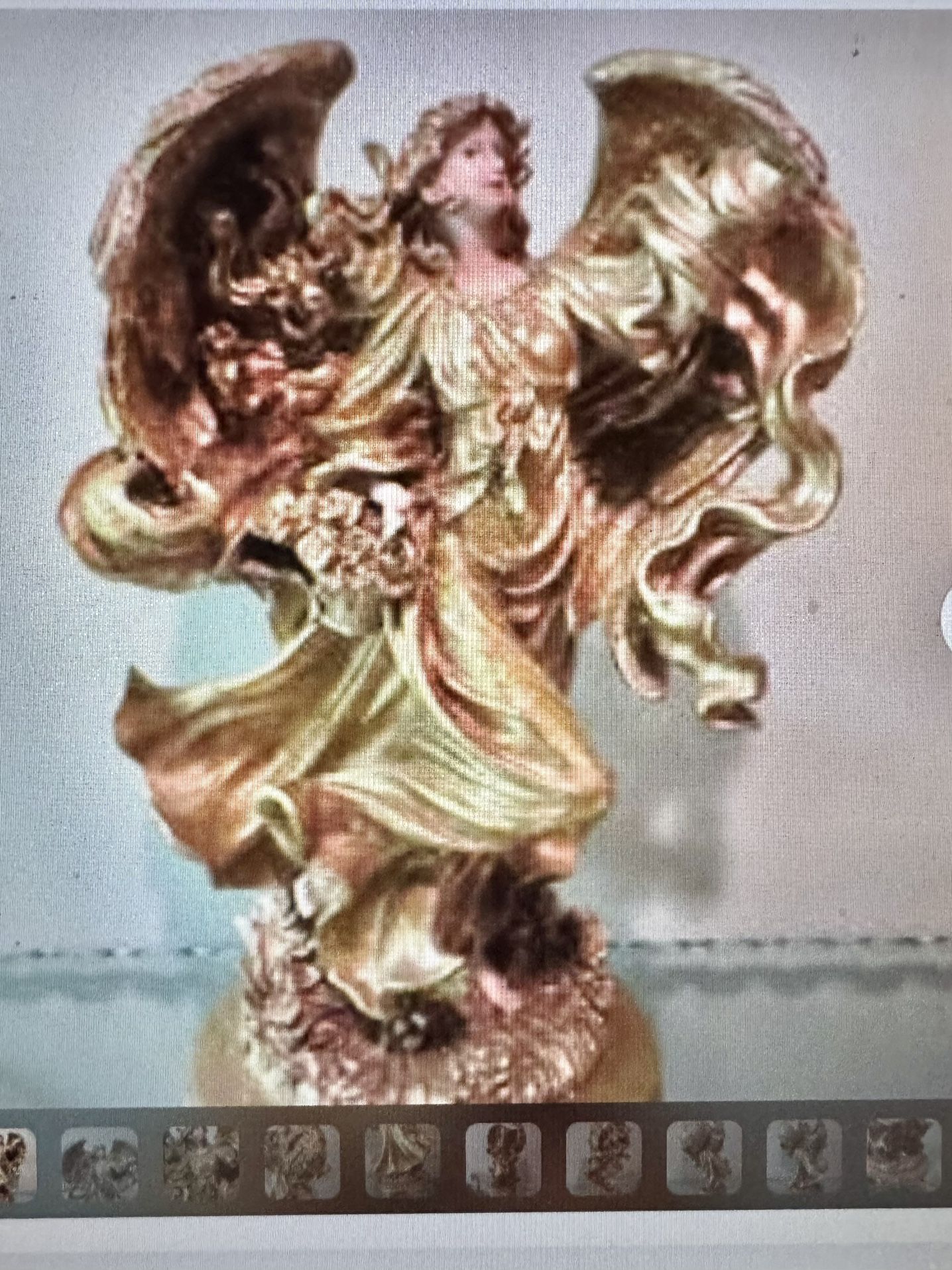 Truly elegant golden gilded Large 22” Angel Figurine Statue with beautiful intricate details throughout the entire piece. Realistic looking face and delicate hands. This item has a lot of sparkle. Measures 22” tall x 14” wide x 8 “ deep. Heavy piece. Excellent Like New condition. Box included. Amazing look for the holidays placed as a centerpiece in a table, shelf, tabletop, on the piano or buffet. STUNNING PIECE to add to your home Decor or Gift!
