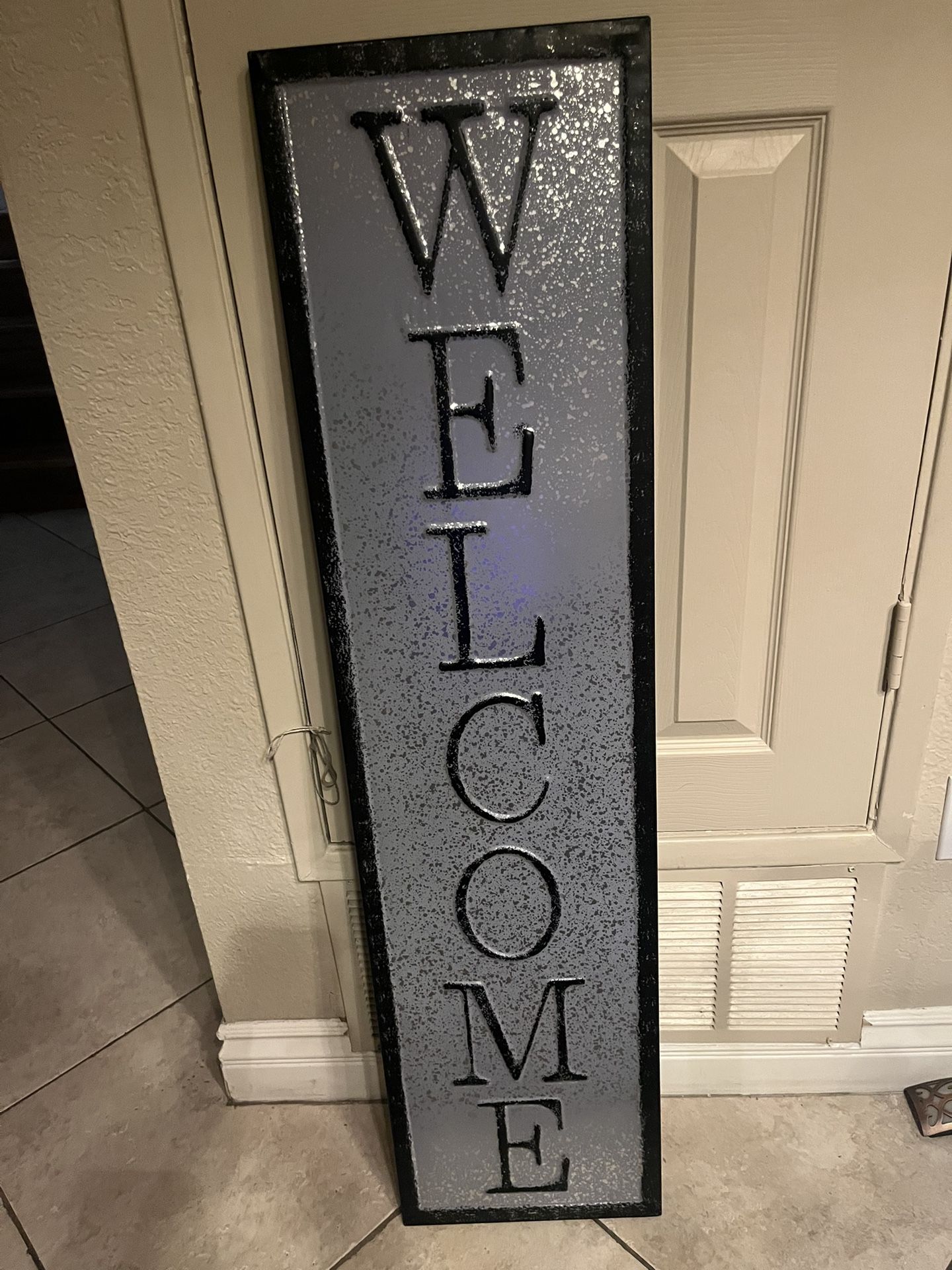 To Metal welcome Saenz… The word Welcome is embossed into the Metal - approximately 3 feet high by 8 inches wide… $10 each or both for $15… Items are located in Lake Forest California, which is south Orange County… Cross streets are jeronimo and Lake Forest Dr.