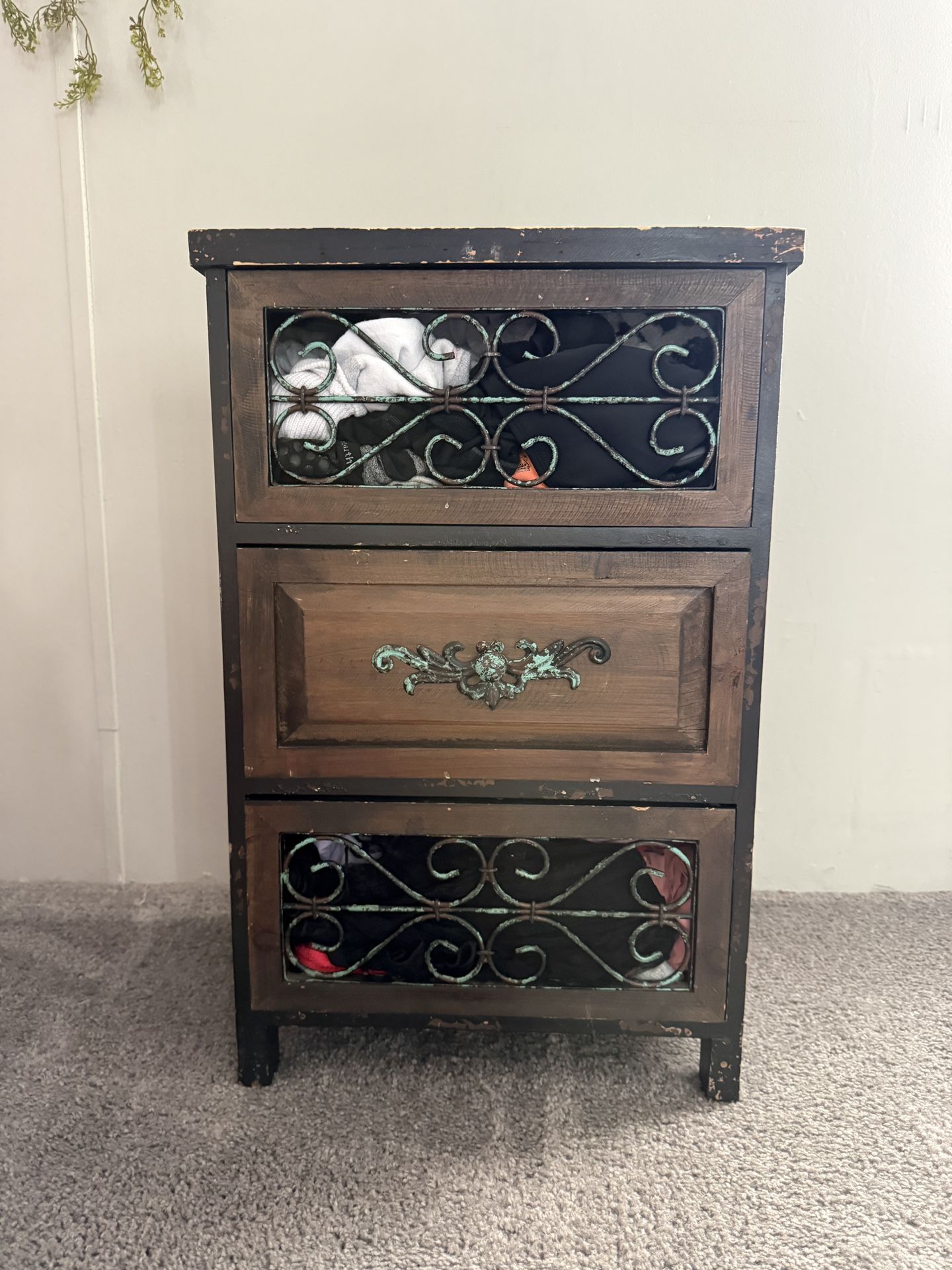MOVING SALE Distressed nightstand Used, good condition Roughly 26” tall x 12” deep