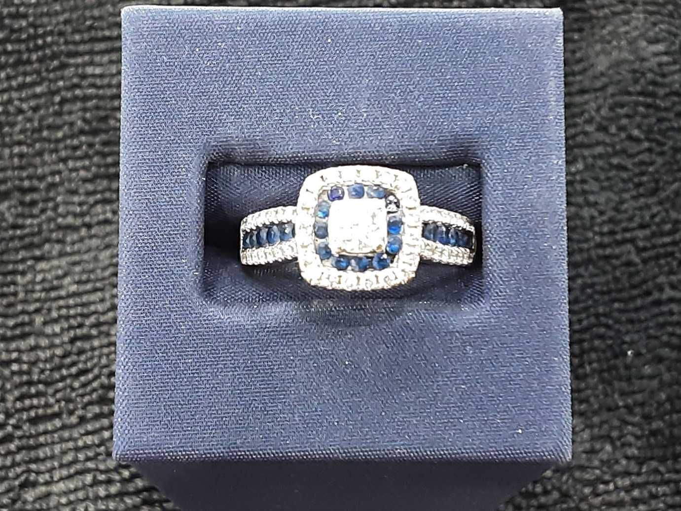 Overview Material Type Gold Weight (in grams) 6 Color White Karat 14K (.585) Ring Size 9 Stone Details # of Stones Color Size Shape Quality 1 Diamond 25 Round Low 22 Blue 1 Round Promotional 50 Diamond 1 Round Low