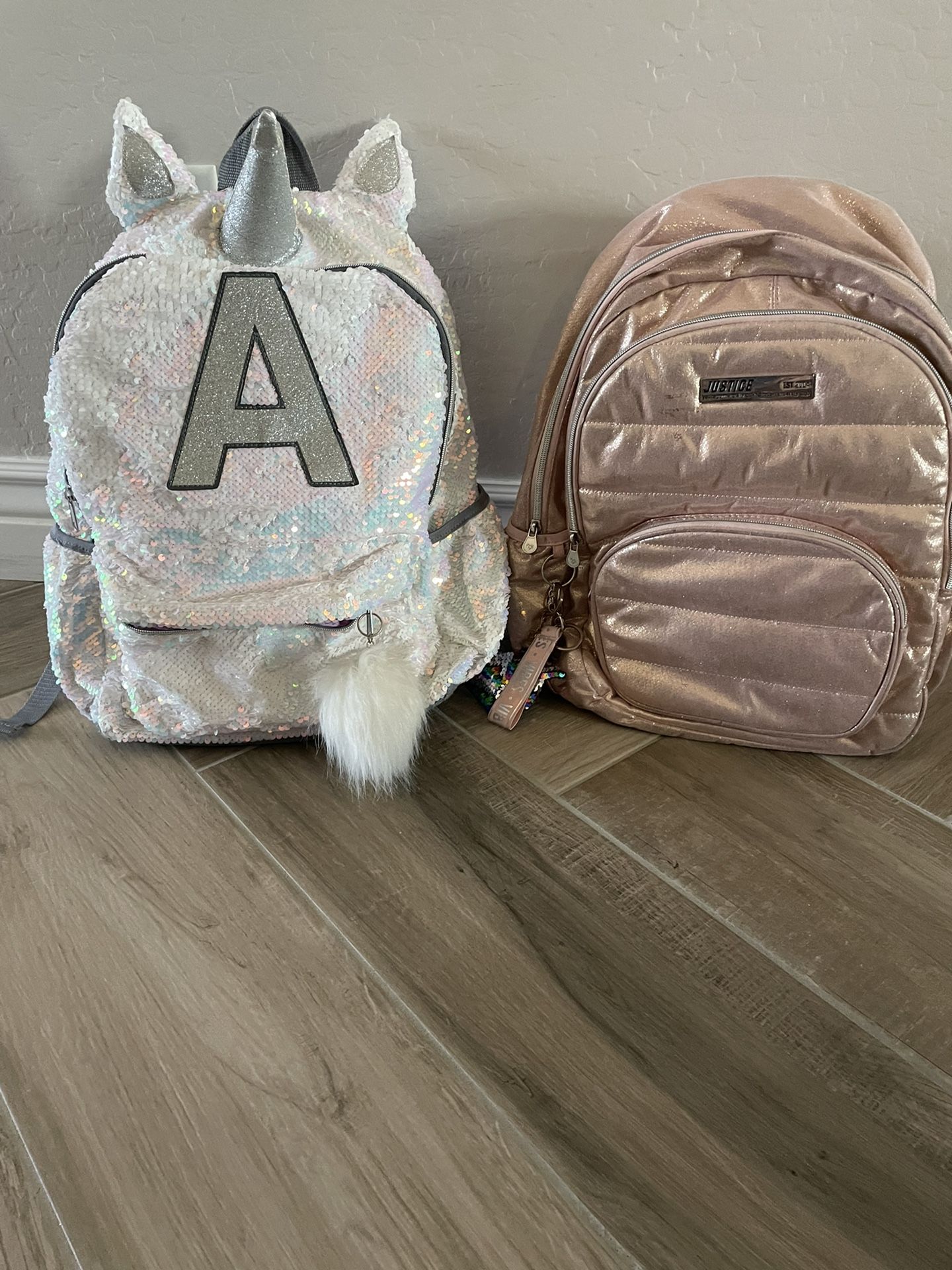 Unicorn Sequins backpack with initial “A” from Justice store SOLD Matching lunch bag with initial A - $5 Rose gold shimmery backpack from Justice store $10 Excellent condition Pick up 67th ave north of happy valley rd