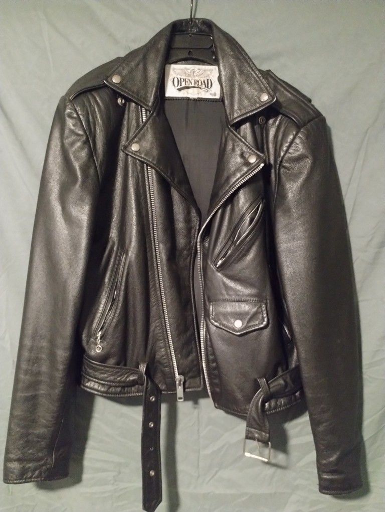 90s vintage Open road leather biker jacket. Genuine leather.. no rips no tares.. the zippers zip and the buttons button.. size 40.. bad ass jacket. My loss and your gain