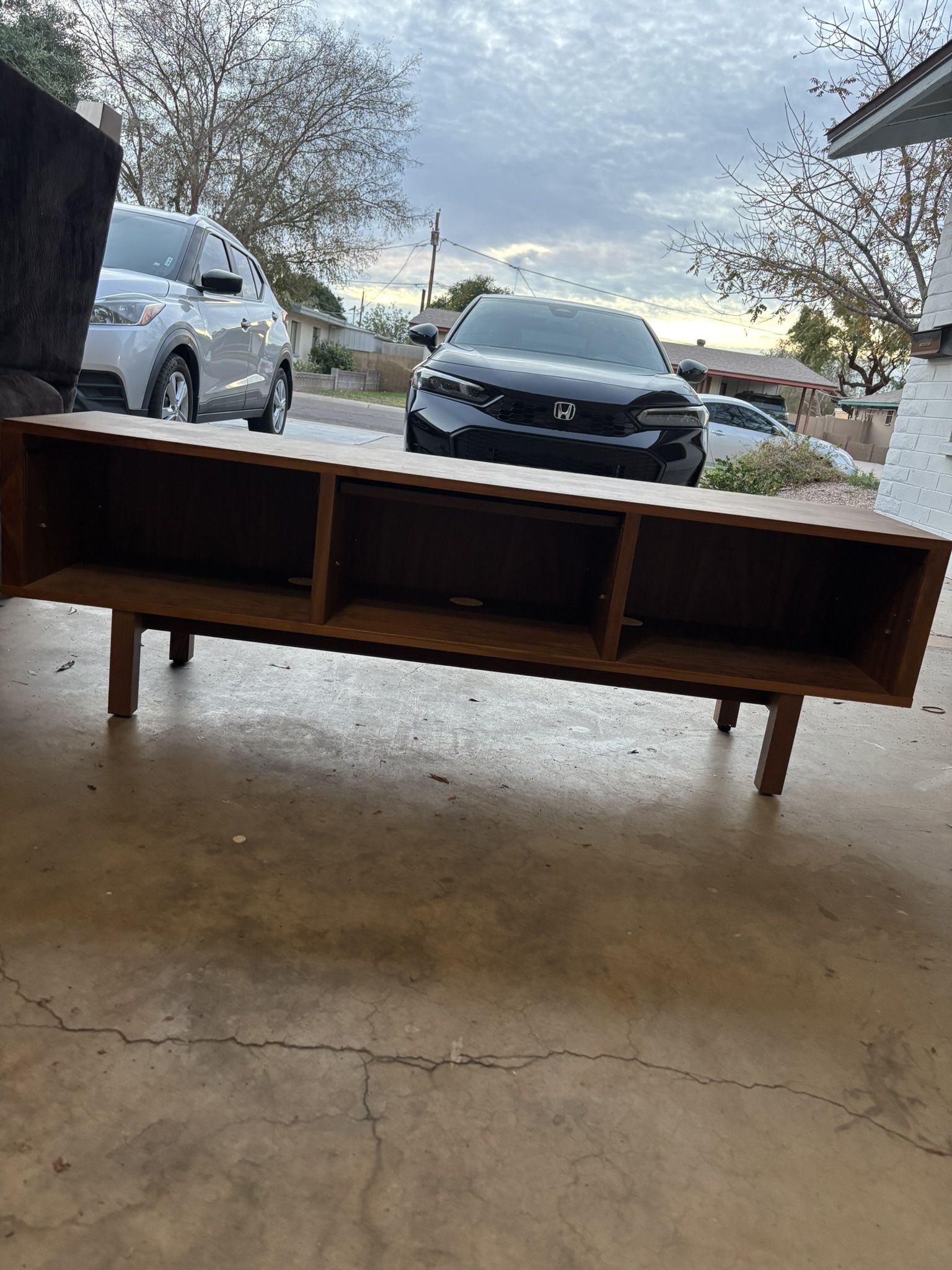 Sturdy TV stand / entertainment center with a clean, modern look. Great size for living rooms, bedrooms, or apartments. Fits most TVs comfortably and has plenty of space for media devices and decor. Measurements: • Length: 5’3” • Width: 1’4” • Depth: 1’3” • Height: 1’7” Note: The cabinet doors are partially broken, but can be fixed. The stand itself is solid and fully functional aside from that.
