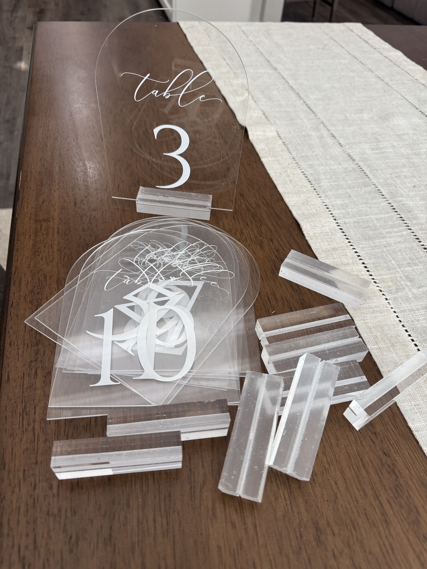 Clear acrylic. Used one night for our wedding. Tables 1-10 with acrylic bases.