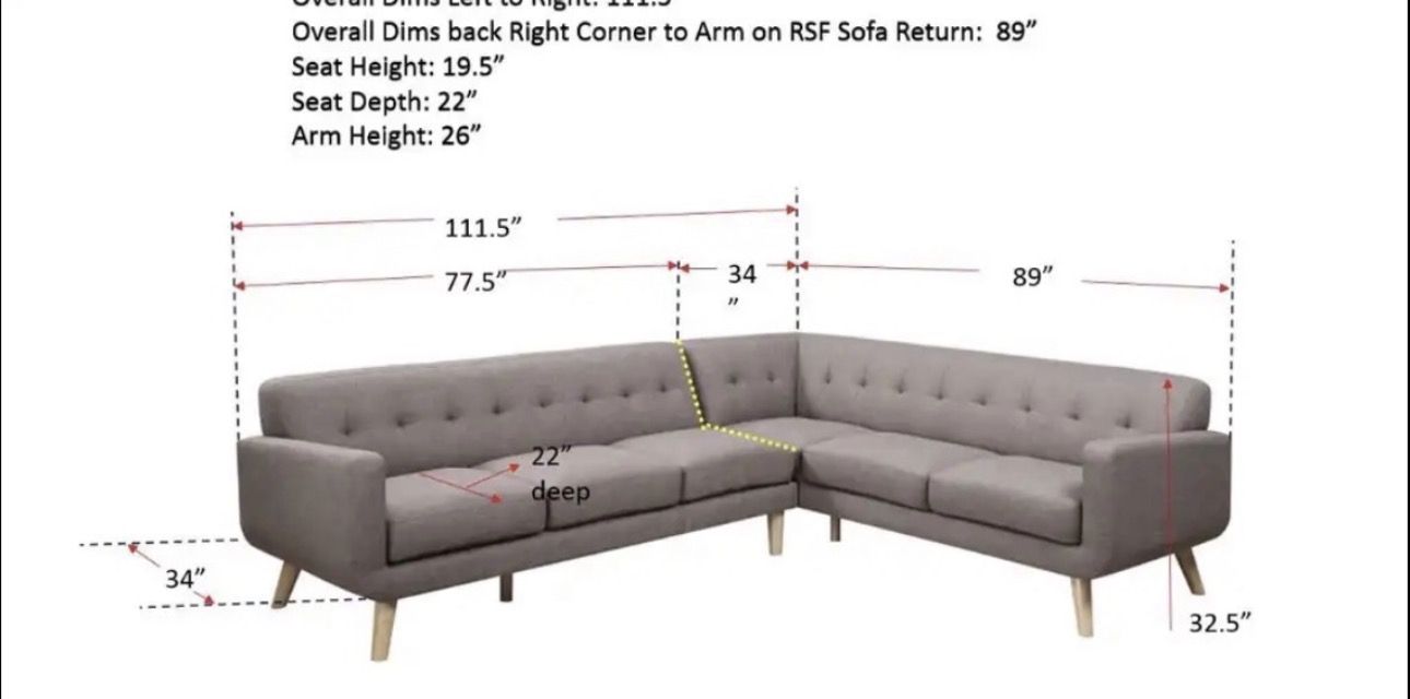 Modern L-shaped sectional couch in a neutral gray fabric that goes with almost any decor. Features a tufted back, clean lines, and light wood tapered legs for a stylish mid-century look. Very comfortable and great for a living room, apartment, or family space. Condition: Used with some wear on the armrests (see photos) but still sturdy and plenty of life left. Cushions are supportive and the couch sits nicely in a corner to save space. Pick up only. You will need a person to help and a truck to fit it as it is pretty large. As-is, we are moving so we want to clear the space