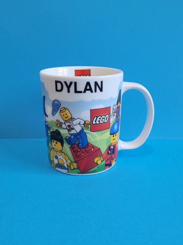 The product is a 2006 LEGO themed coffee mug featuring the character "DYLAN". This colorful 10oz. ceramic and porcelain cup is perfect for both hot and cold beverages, with a playful design suitable for children. The multicolor pattern and LEGO franchise theme make it a fun and collectible piece for fans of the brand. Made in China, this original coffee mug is a great addition to any LEGO enthusiast's kitchen or collection. Don't forget to visit my store to see a variety of toys from different brands, figures, electronics, and all sorts of treasures (vintage and new!)