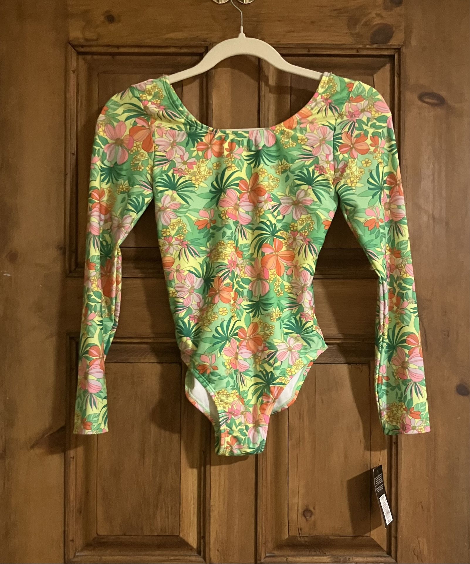 Bright tropical floral print cover-up one piece swimsuit. Size Large in girls. Never worn, still has tag and sanitary protecter. Comes from a smoke free home.