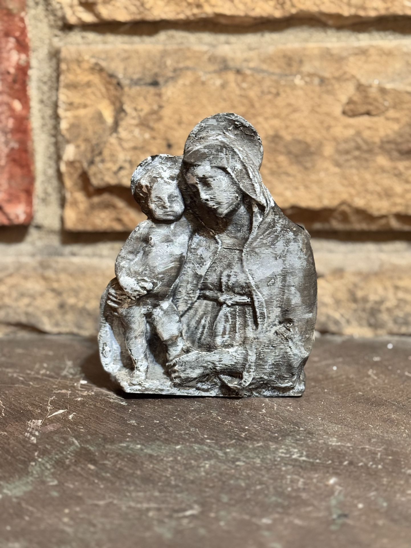 Artisan poured in small batches, this Madonna and Child is cast in dense cement then washed with layered mineral pigments that give a soft limestone look, the gentle curves of Mary’s veil and the Infant’s face highlighted by careful hand polishing, sealed with a matte protectant so the piece can rest on an indoor prayer shelf or in an outdoor grotto, measuring about 6 in high, 5 in wide and 1.5 in deep, felt pads under the base guard wood and stone surfaces, each pour shows subtle variations that make every statue unique, ideal for Catholic home altars, baptism or confirmation gifts, rustic farmhouse décor, Christian nursery accents and faith-focused housewarming presents, keywords woven naturally include Catholic art, Virgin Mary sculpture, handmade devotional gift, stone-look finish and artisan Christian décor.